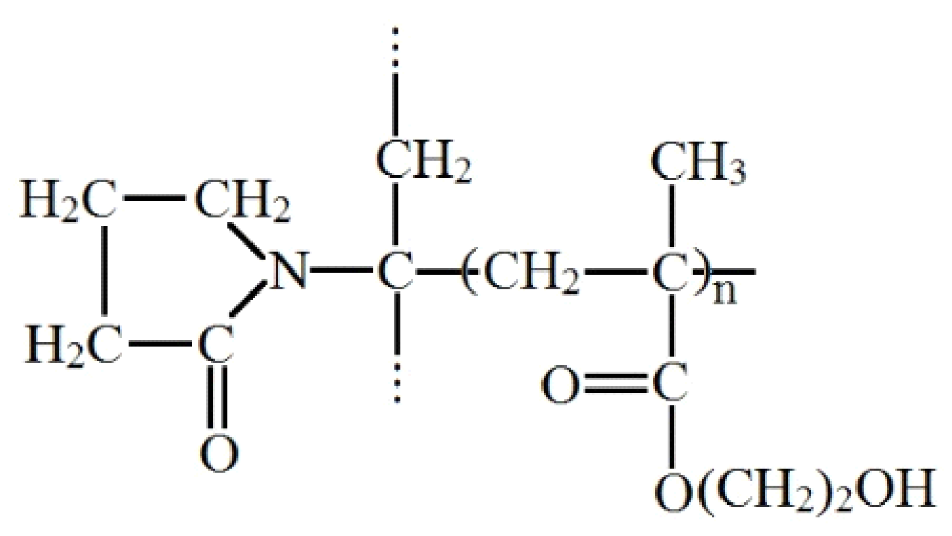 - Grytsenko, O.; Dulebova, L.; Suberlyak, O.; Skorokhoda, V.; Spišák, E.; Gajdos, I. Features of structure and properties of pHEMA-gr-PVP block copolymers, obtained in the presence of Fe2+. Materials 2020, 13, 4580. [Google Scholar] [CrossRef]