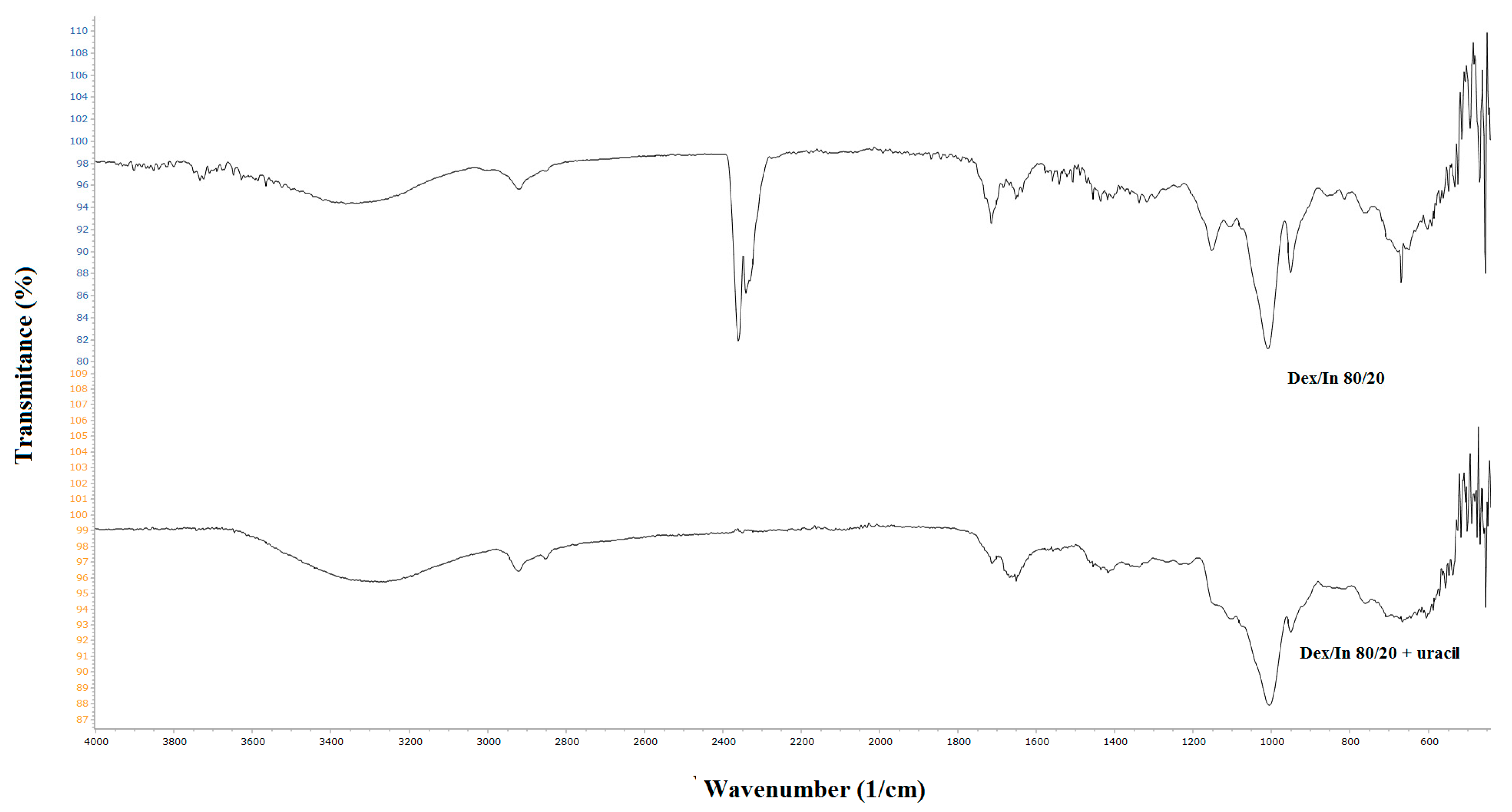 | Uracil-Loaded Hydrogels | Gastric Phase Release, µg/mL | Intestinal Phase Release, µg/mL | Gastric Phase Release, % | Intestinal Phase Release, % | Total Released Amount of Drug, % |