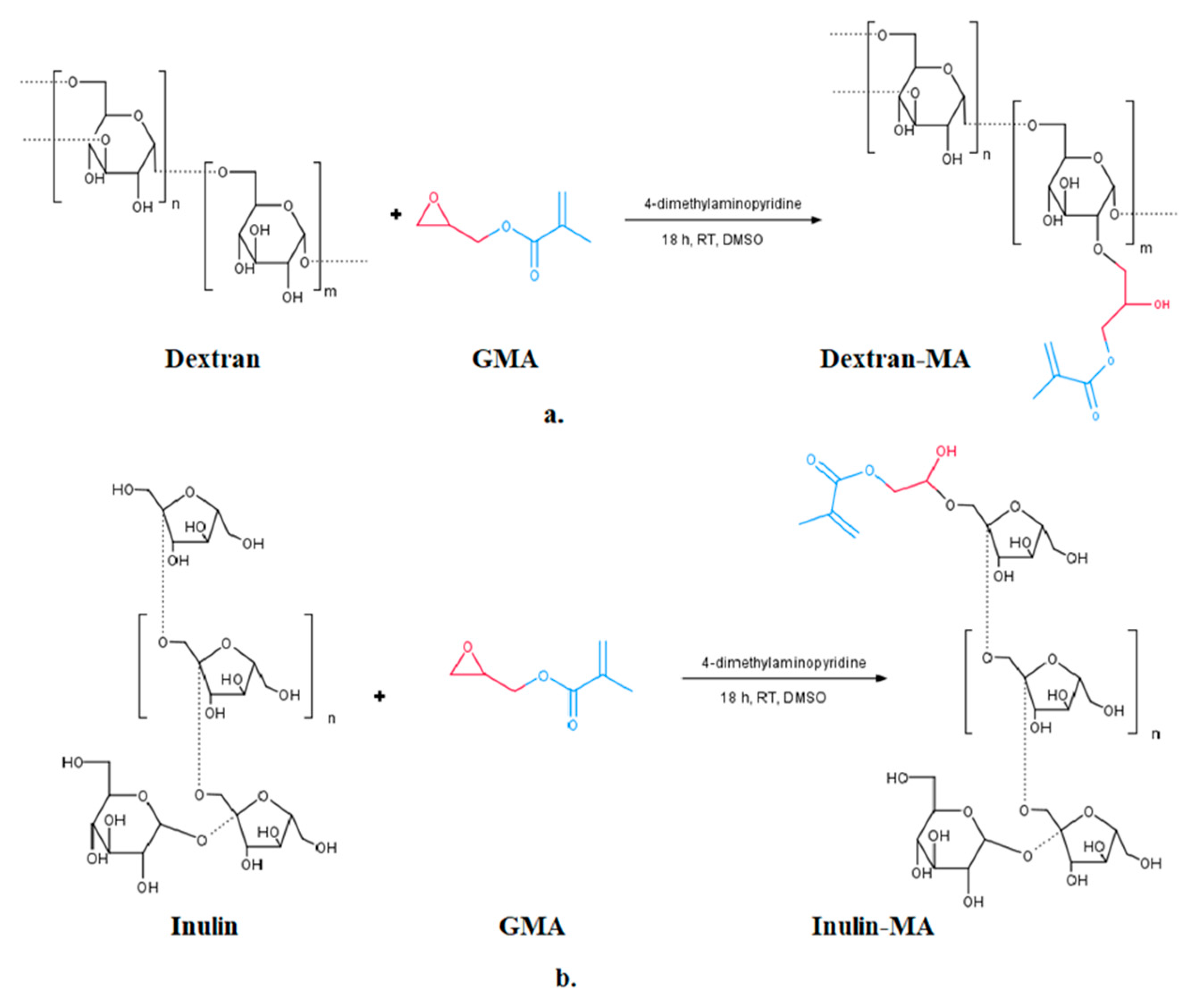 | Samples | Dextran–MA 1, g | Inulin–MA 2, g |