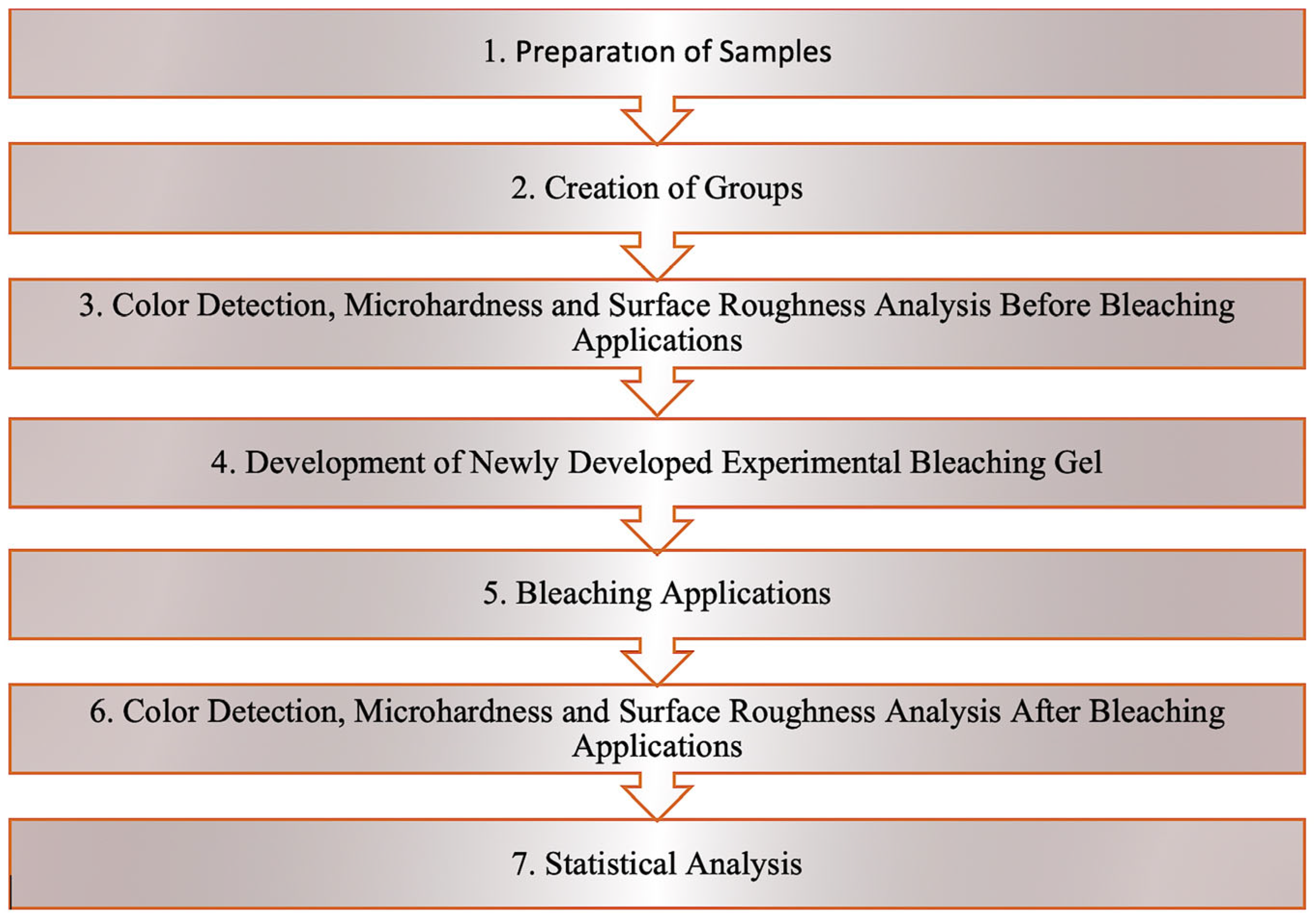 We used 144 human upper central incisors in this study. All samples were standardised in terms of enamel-dentin thickness using a CIBT device (ProMax 3D; Planmeca, Helsinki, 105 Finland). The 144 teeth were divided into four groups according to the bleaching gel treatment (n = 36). The groups were then divided into three subgroups for measurement of colour (n = 12), surface roughness (n = 12), and microhardness (n = 12). The names and descriptions of the four experimental groups: