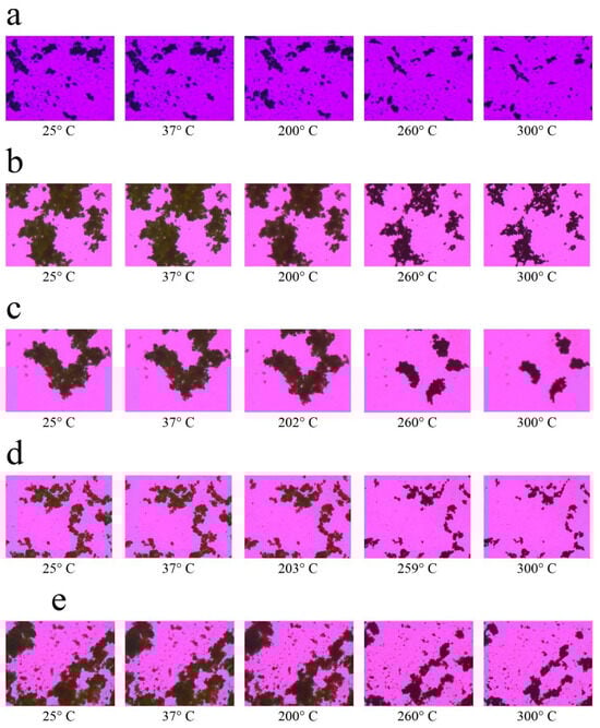 Representative hot-stage microscopy images showing thermal behavior of spray-dried CMC-based microparticles at increasing temperatures. Formulations include: (a) Raw CMC w/v 10% Leucine, (b) 5% Leucine, (c) 2.5% Leucine, (d) 0% Leucine, and (e) CMC/Sur w/v 10% Leucine. Progressive loss of birefringence and structural softening with temperature indicate the thermal transitions and amorphous nature of the co-spray-dried powders.