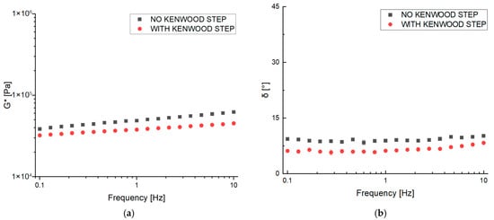 Frequency sweep test of ZBR at 25 °C measuring complex dynamic modulus (a) and phase angle δ (b), with and without Kenwood mixing step.