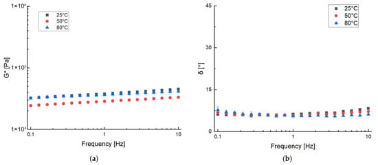 A hamburger sample (Ham) was used as the standard, which was prepared in the laboratory according to a commercial recipe for hamburger and compare it to the veggie burgers. Figure 1 shows the results obtained from frequency sweep tests conducted at 25 °C, 50 °C, and 80 °C in terms of (a) and δ (b). The frequency sweep test graphs reveal a slight increase in the complex modulus () with rising frequency across all conditions. The material exhibited similar consistency at 25 °C and 50 °C, as indicated by the comparable values. In contrast, a significant increase in the complex modulus was noted at 80 °C, which is presumably due to the structuring of meat proteins. This phenomenon aligns with the denaturation range of myosin and actin, the primary myofibrillar protein components, which occurs between 40 °C and 80 °C [17]. Furthermore, the phase angle behavior remained similar at 25 °C and 50 °C, but a pronounced decrease was evident at 80 °C, consistent with a more solid-like behavior and structure of the sample.