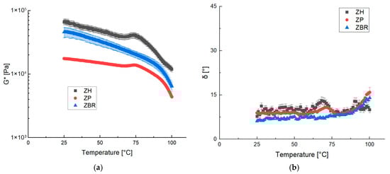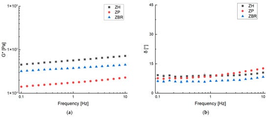 A slight increase in the phase angle relative to the ZBR sample suggests the formation of a less structured dough. Furthermore, a comparison with the dough where black rice proteins were substituted with pea proteins revealed a distinct decrease in consistency. This decrease was quantitatively confirmed by lower values and a material exhibiting a greater dependence on frequency. The phase angle values are similar to those found for the ZH sample, suggesting that this sample was also less structured. Plant proteins mostly consist of glutenin, globulin, albumin, and prolamin, whose proportions differ in different proteins [27]. The ZBR sample showed the lowest frequency dependence, indicating a more structured compound, as confirmed by the lower phase angle values; this result confirms the better solubility of rice proteins at the mixing temperature inside the matrix during the sample preparation phase. At 80 °C, the solubility of plant proteins depends on many factors, such as pH and the solutes present. Furthermore, it also depends on the specific type of protein, since for some plant proteins, such as pea and hemp, the temperature can be high enough to induce thermal denaturation of the plant proteins and therefore partial denaturation. This latter phenomenon leads to a reduction in solubility and to aggregation or coagulation, and therefore to drastic solubilization [28,29].