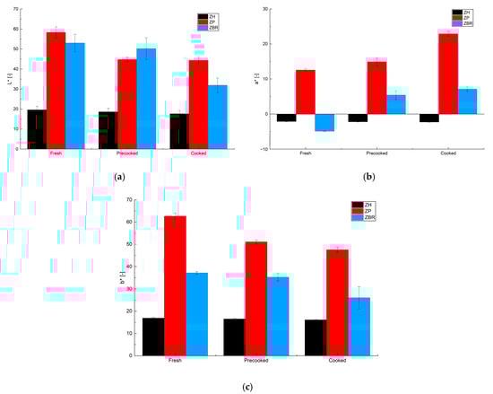 Color analysis was performed on the prepared samples—specifically in the fresh, precooked, and cooked states—by evaluating the L*, a*, and b* parameters, as defined in Section 4.4; the results are presented in Figure 8. Regarding the L* parameter (lightness), a decrease was observed during the cooking process. As anticipated, increasing the temperature during cooking promoted a browning effect typical of Maillard reactions. While this reaction also occurs in vegetable protein-based products, its intensity is generally less pronounced than in their meat-based counterparts [35]. This effect was significantly mitigated in the hemp protein-based sample (ZH), while the L* value remained nearly constant. The naturally dark color of the hemp proteins resulted in a darker initial mixture that underwent minimal change during thermal processing. Conversely, the a* values (redness/greenness) generally tended to increase during cooking, causing the samples to shift from a greenish hue toward a more reddish one. This effect, similar to the changes in L*, was attenuated in the ZH sample, which was less susceptible to these variations due to its intensely dark initial color. Finally, the b* parameter (yellowness/blueness) showed a significant decrease during cooking, resulting in a transition from an intense yellow color to a less pronounced one. There was also only a slight variation in the b* parameter in the ZH sample.