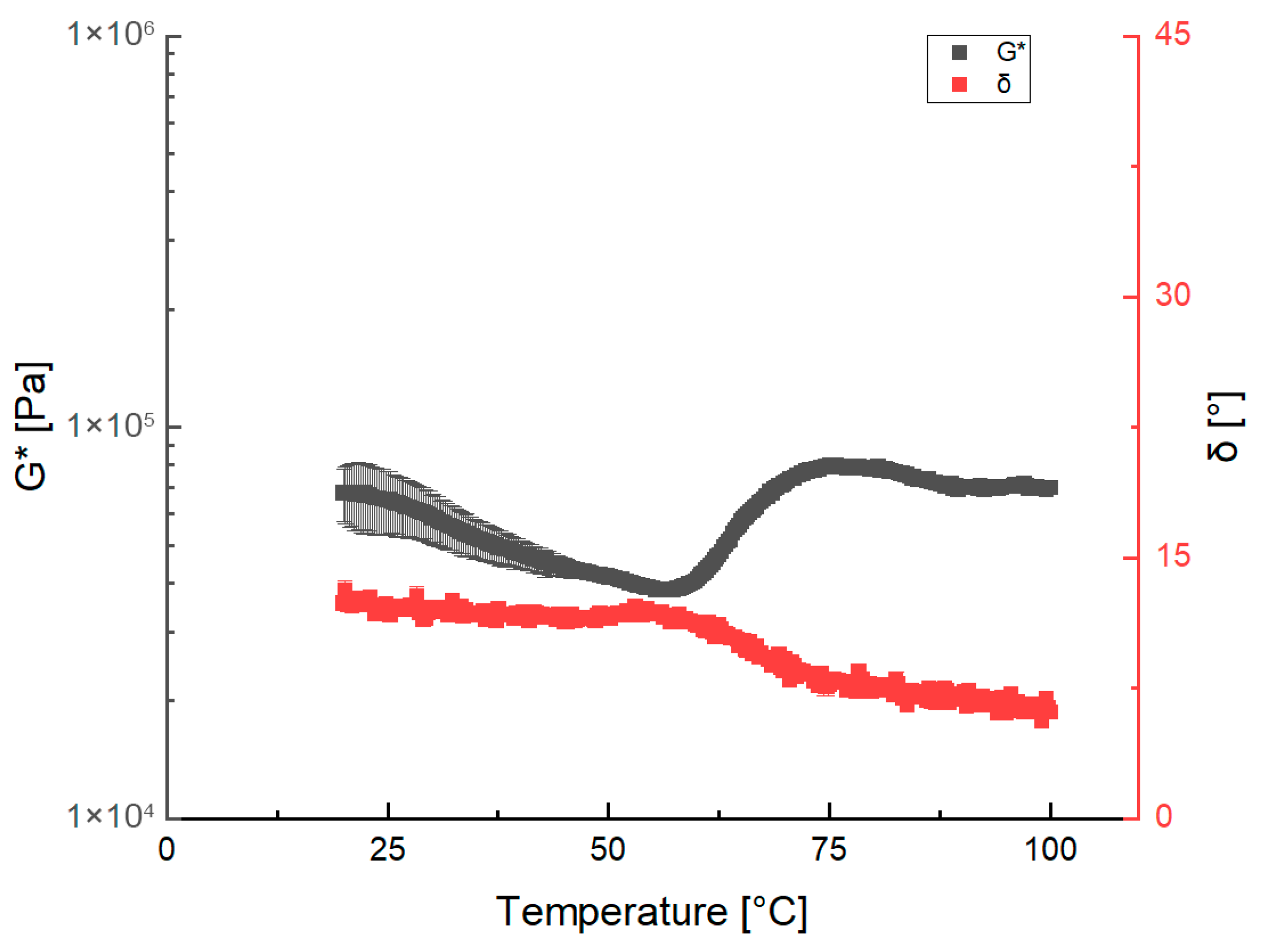 31]. The thermal ramp probably does not allow for the visualization of the structural changes that occur at high temperatures; these are more evident from the frequency sweeps (