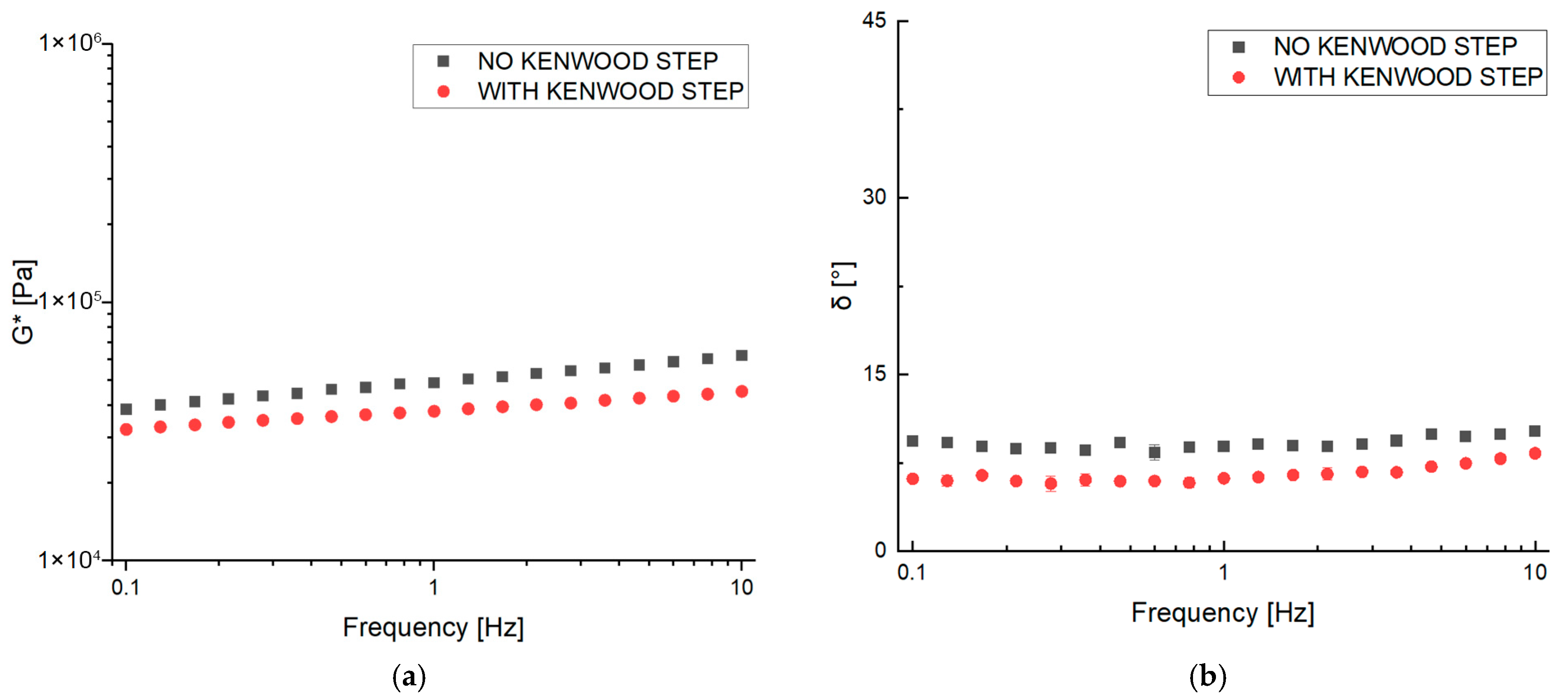 Figure 3). The decrease in the consistency of the mixture due to the mixing step is consistent with the literature. In particular, it has been observed that as mixing times increase, samples of soy flour showed decreased complex viscosity dynamic moduli [
