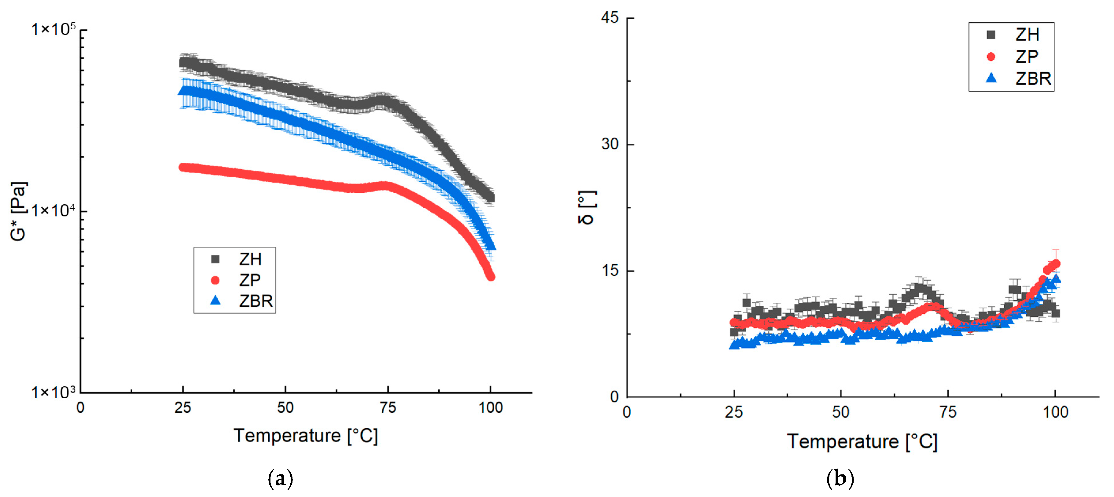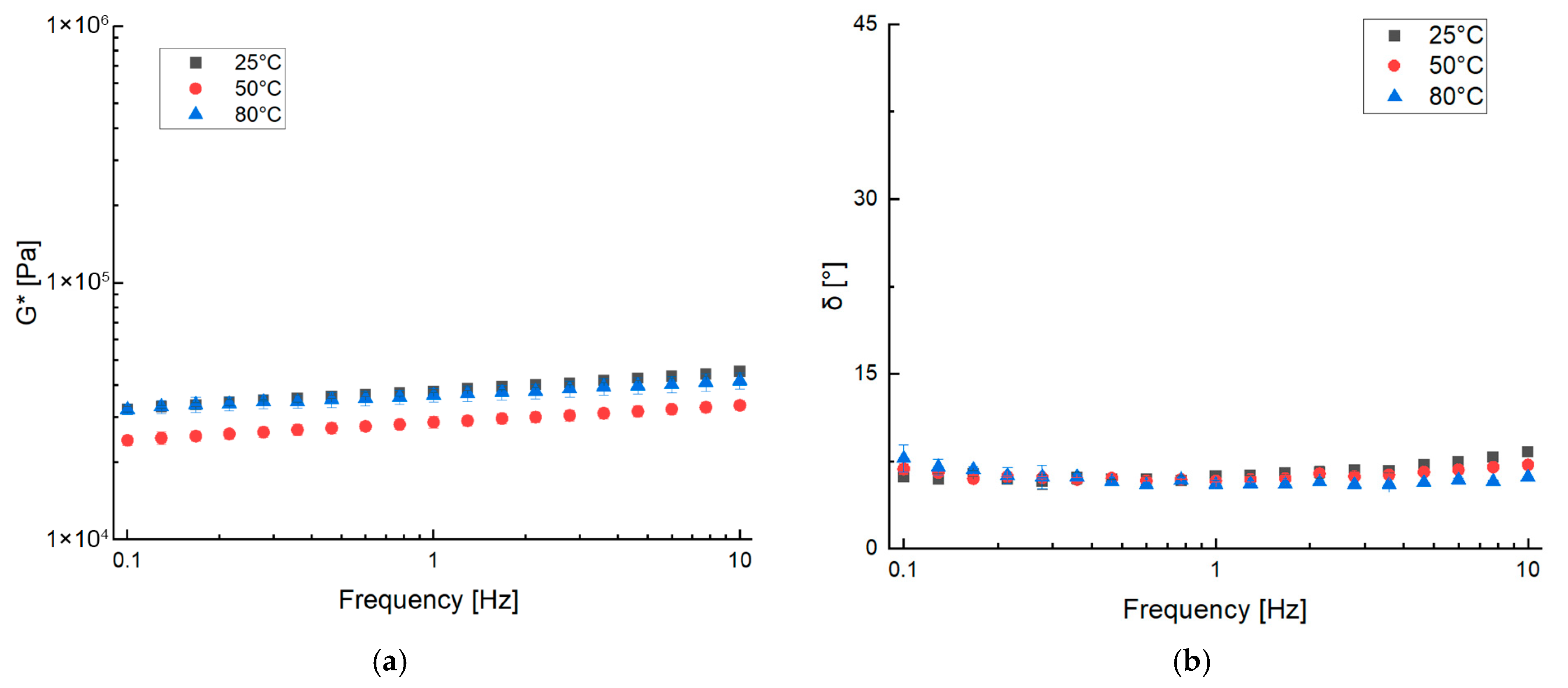 17]. Furthermore, the phase angle behavior remained similar at 25 °C and 50 °C, but a pronounced decrease was evident at 80 °C, consistent with a more solid-like behavior and structure of the sample.