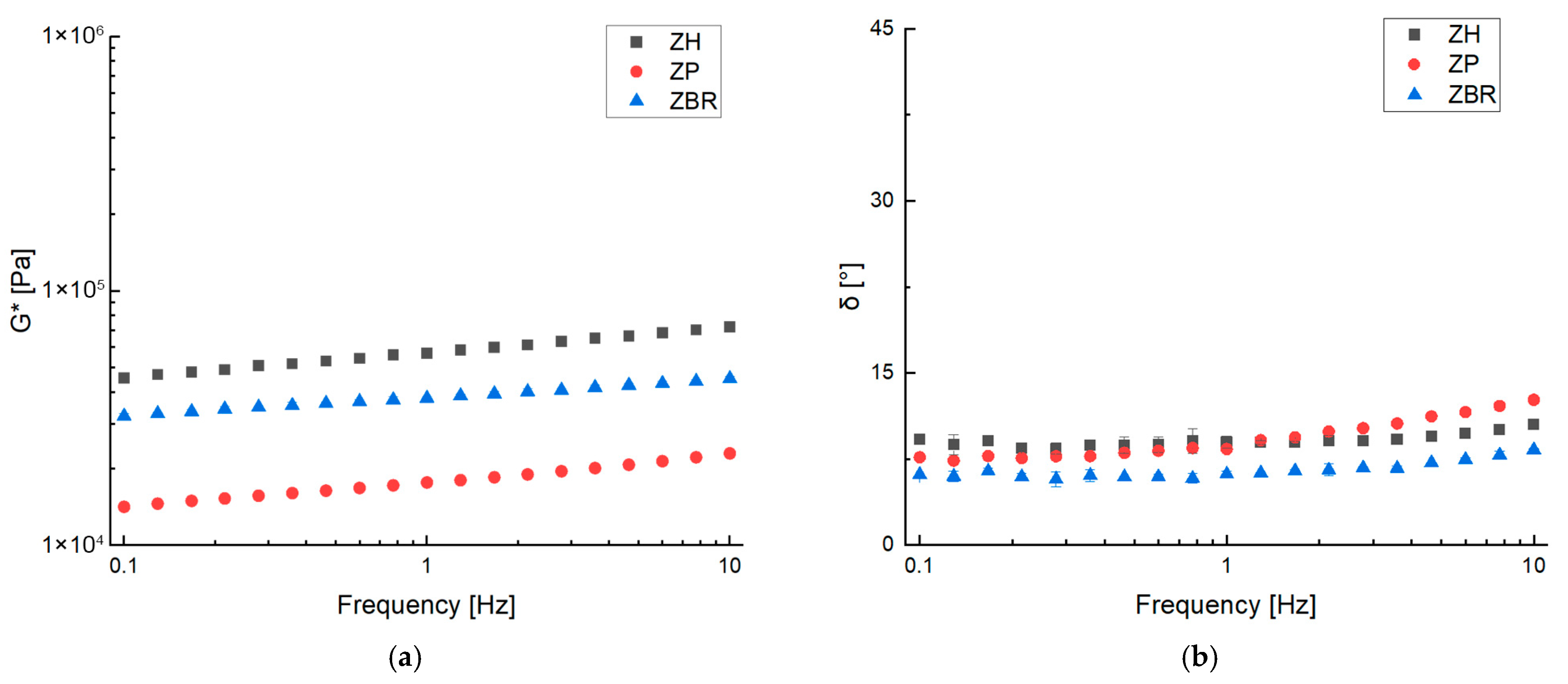 27]. The ZBR sample showed the lowest frequency dependence, indicating a more structured compound, as confirmed by the lower phase angle values; this result confirms the better solubility of rice proteins at the mixing temperature inside the matrix during the sample preparation phase. At 80 °C, the solubility of plant proteins depends on many factors, such as pH and the solutes present. Furthermore, it also depends on the specific type of protein, since for some plant proteins, such as pea and hemp, the temperature can be high enough to induce thermal denaturation of the plant proteins and therefore partial denaturation. This latter phenomenon leads to a reduction in solubility and to aggregation or coagulation, and therefore to drastic solubilization [