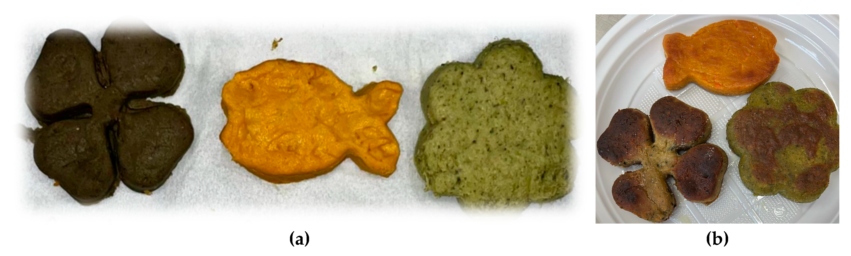 Specifically, different shapes were created using molds and the different samples were precooked for a time equal to 25% of the total cooking time. After pre-cooking, they were immediately frozen at −18 °C for 15 days, after which, they were baked in an oven (Unox XF013, Stefania, Padova, Italy) under static conditions for 30 min at 180 °C.