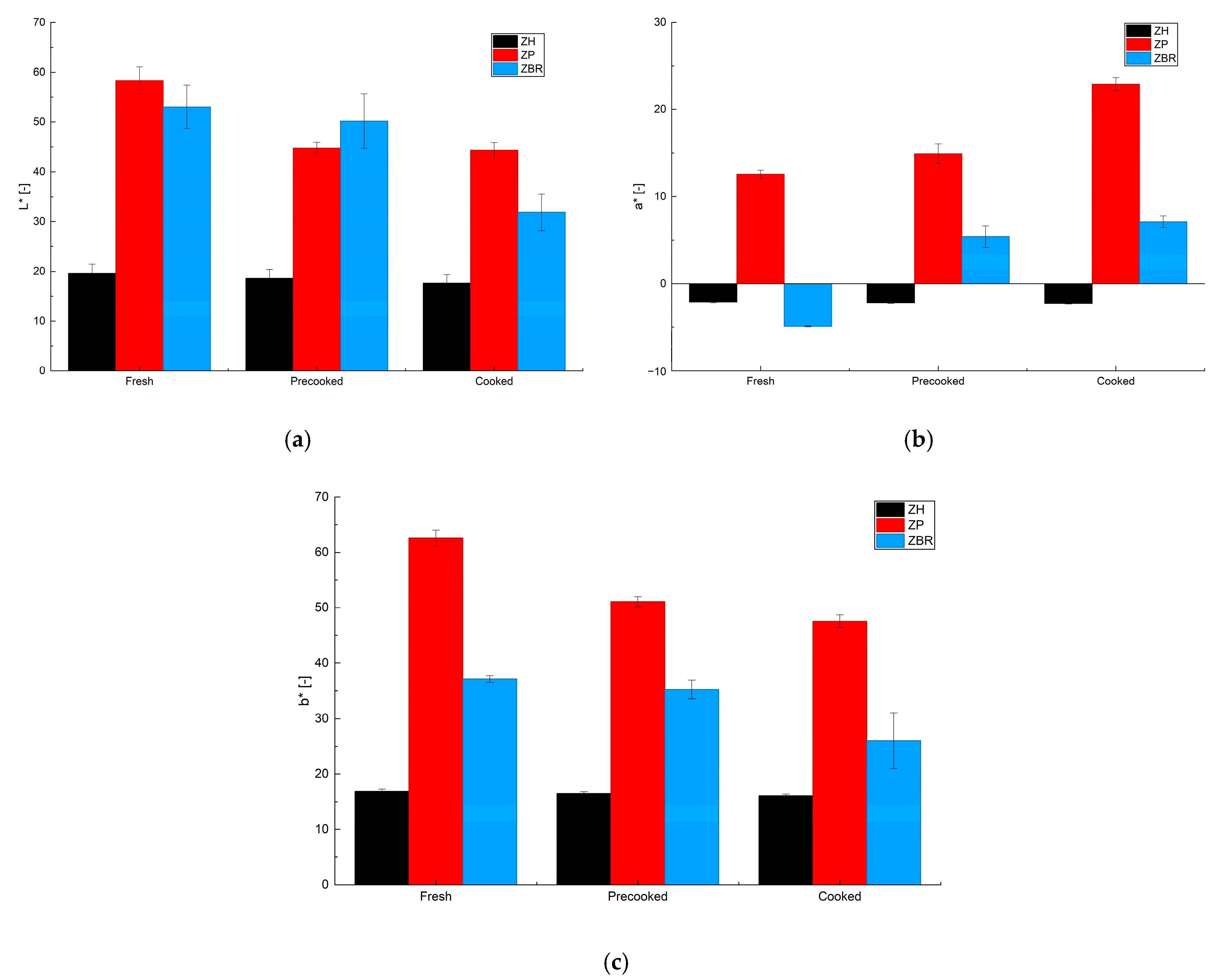 Color analysis was performed on the prepared samples—specifically in the fresh, precooked, and cooked states—by evaluating the L*, a*, and b* parameters, as defined in