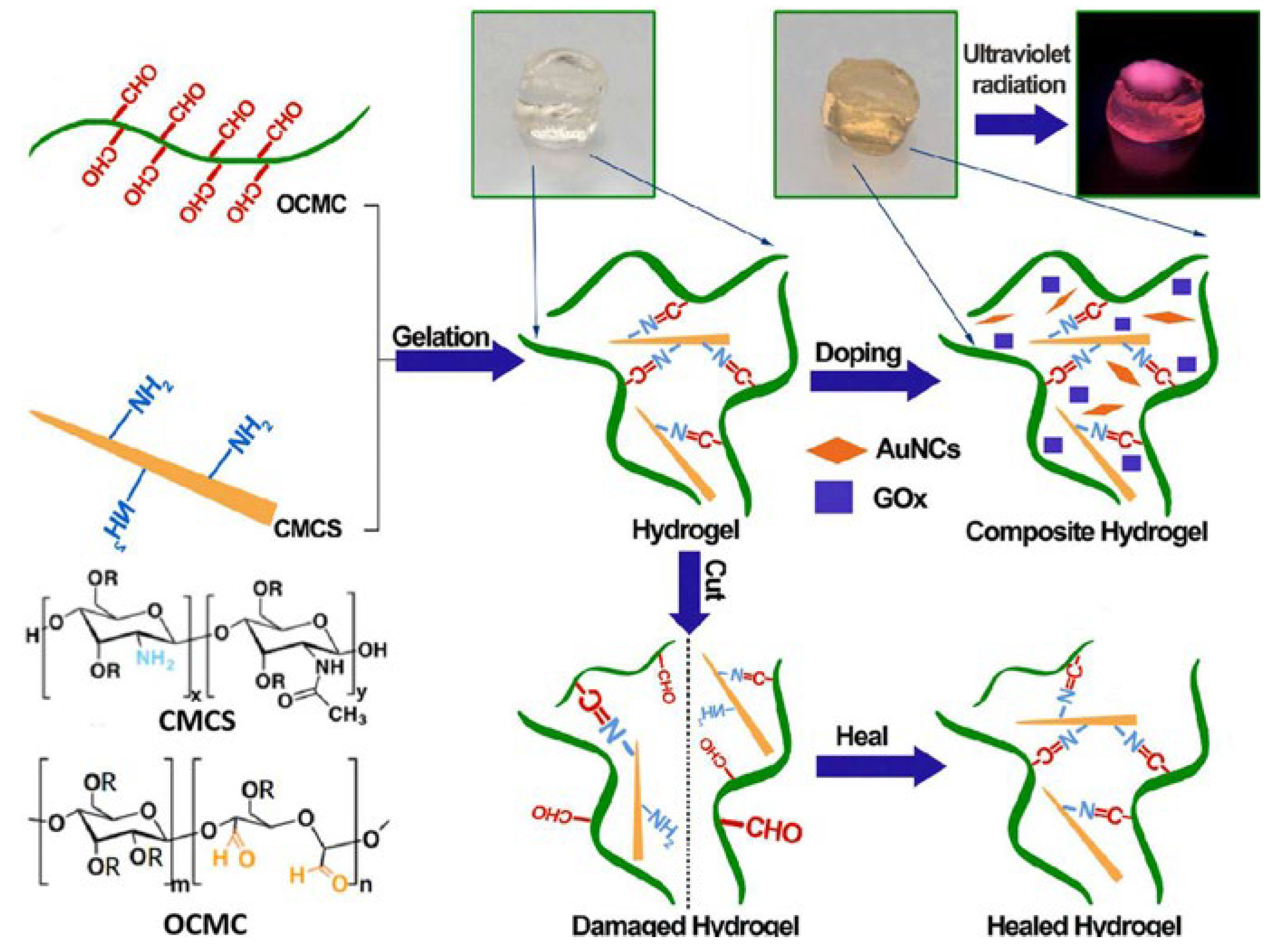 - Shen, Y.; Wang, Z.; Wang, Y.; Meng, Z.; Zhao, Z. A self-healing carboxymethyl chitosan/oxidized carboxymethyl cellulose hydrogel with fluorescent bioprobes for glucose detection. Carbohydr. Polym. 2021, 274, 118642. [Google Scholar] [CrossRef]