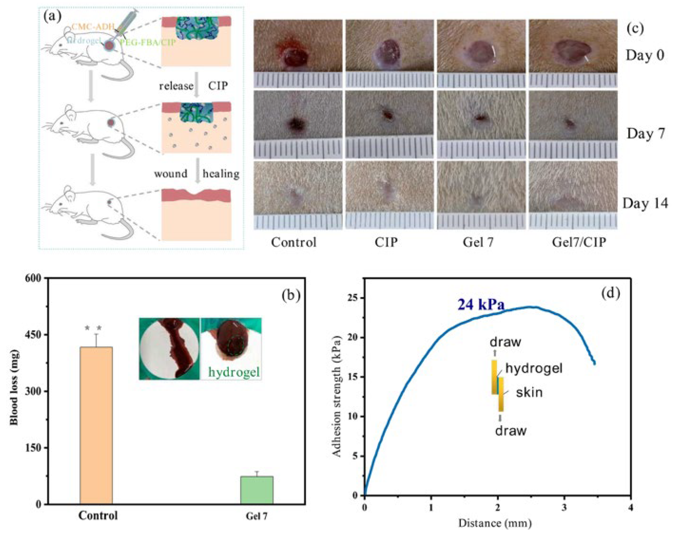 - Wang, W.; Yuan, Z.; Li, T.; Wang, Y.; Zhang, K.; Wu, J.; Zhang, S.; Yuan, F.; Dong, W. Rapid preparation of highly stretchable and fast self-repairing antibacterial hydrogels for promoting hemostasis and wound healing. ACS Appl. Bio Mater. 2024, 7, 394–405. [Google Scholar] [CrossRef]