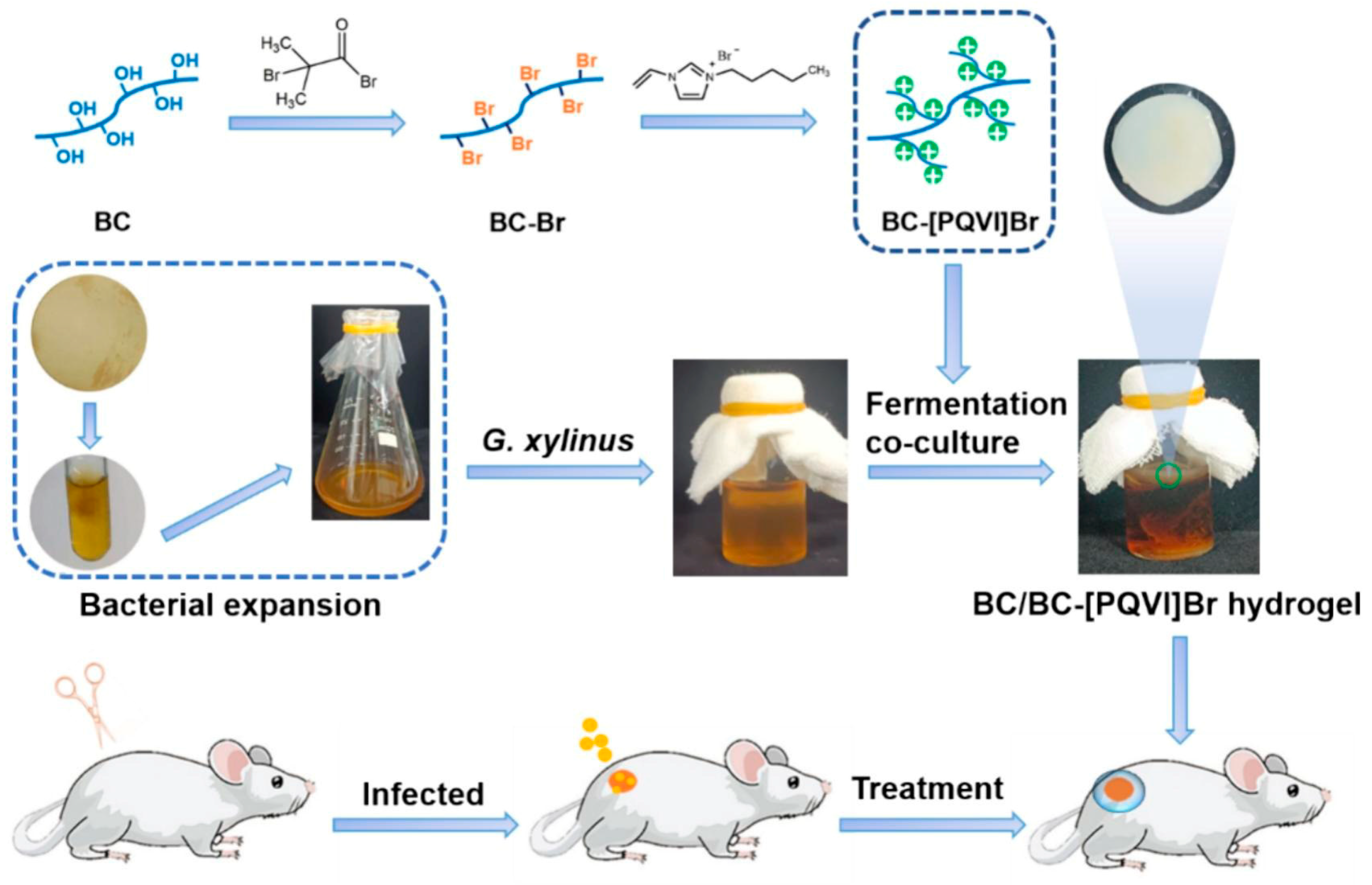 - Meng, S.; Borjihan, Q.; Xiao, D.; Wang, Y.; Chen, M.; Cheng, C.; Dong, A. Biosynthesis of positively charged bacterial cellulose hydrogel with antibacterial and anti-inflammatory function for efficient wound healing. Int. J. Biol. Macromol. 2024, 279, 135263. [Google Scholar] [CrossRef]