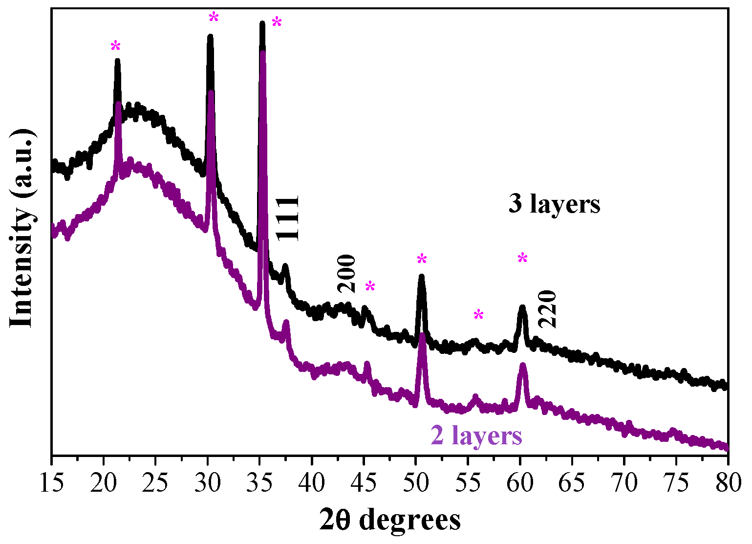 | Substrate | Number of Layers | Annealing (°C) | 2θ Degrees | Miller Indices | FWHM | Crystallite Size (nm) |