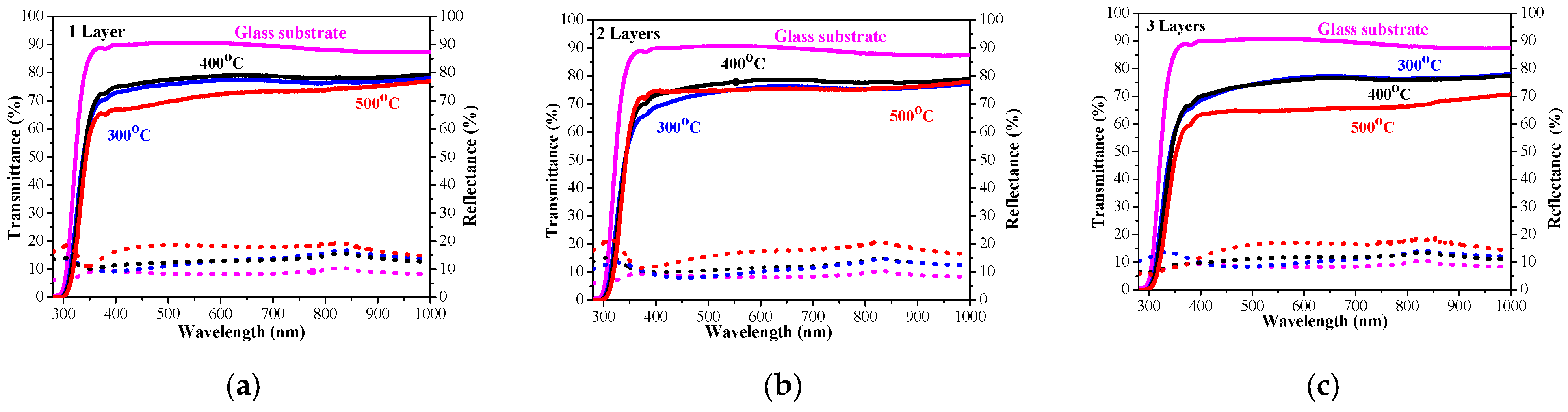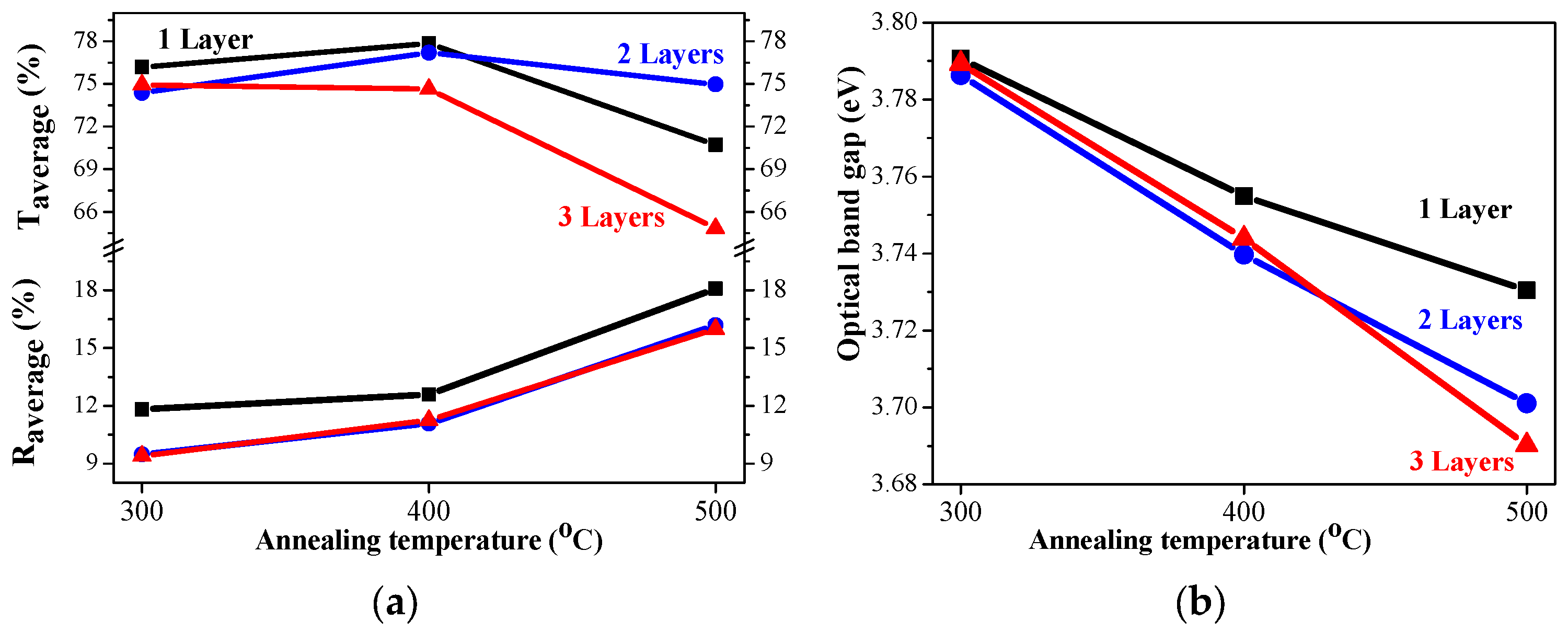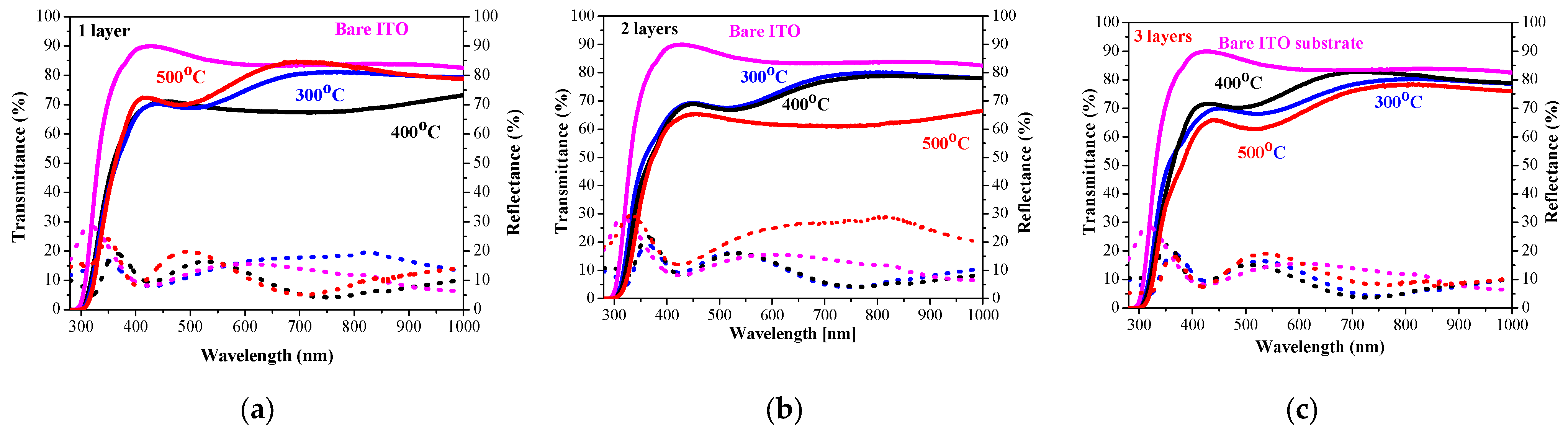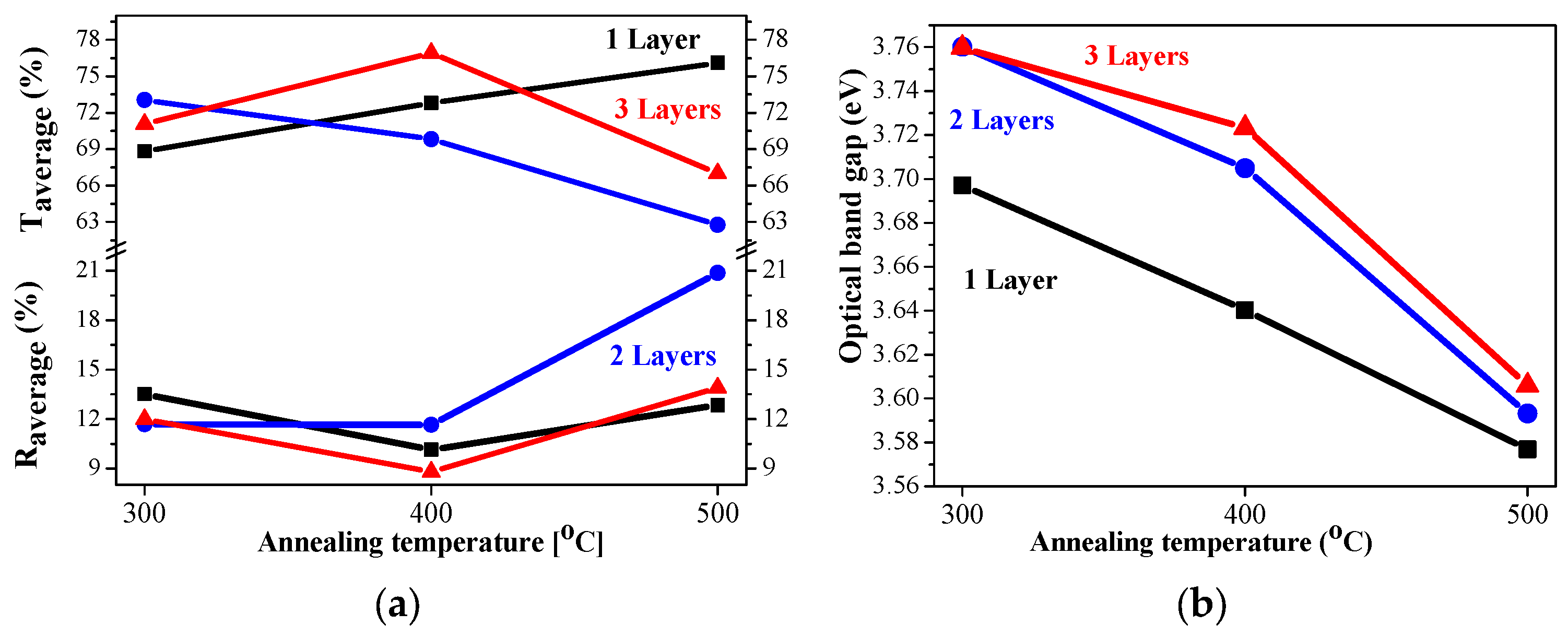 | Number of Layers | Annealing Temperature (°C) | Rsheet, (Ω/□) | Taverage (%) λ = 450–700 nm | Figure of Merit ×10−5 (Ω−1) |