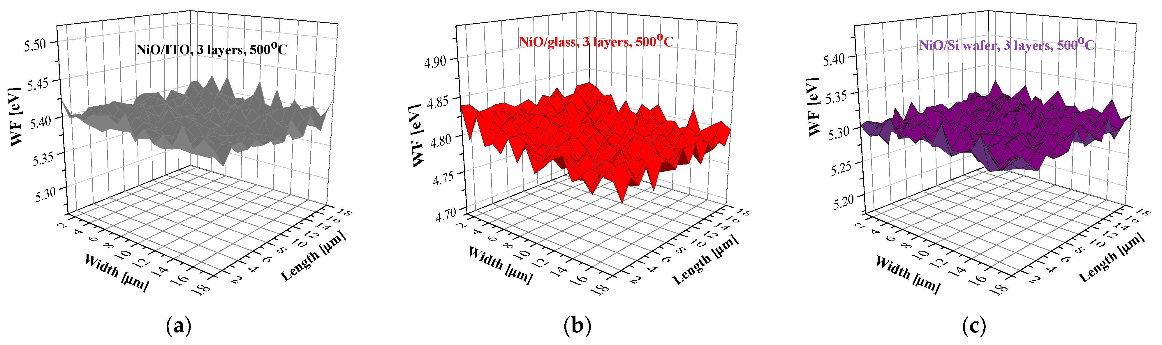 2.6.2. Work Function (WF) of Sol–Gel NiO Films, Deposited on Si, Glass, and ITO Substrates