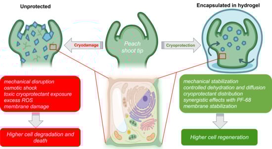 This study demonstrates that cryogel-inspired alginate matrices co-formulated with Pluronic F-68 markedly improve vitrification efficiency and post-thaw recovery of Prunus persica shoot tips. By moderating cryoprotectant diffusion, stabilizing water in an amorphous state, and enhancing membrane robustness, the alginate–PF-68 system provides a physically and physiologically protective microenvironment that significantly reduces cryo-injury.