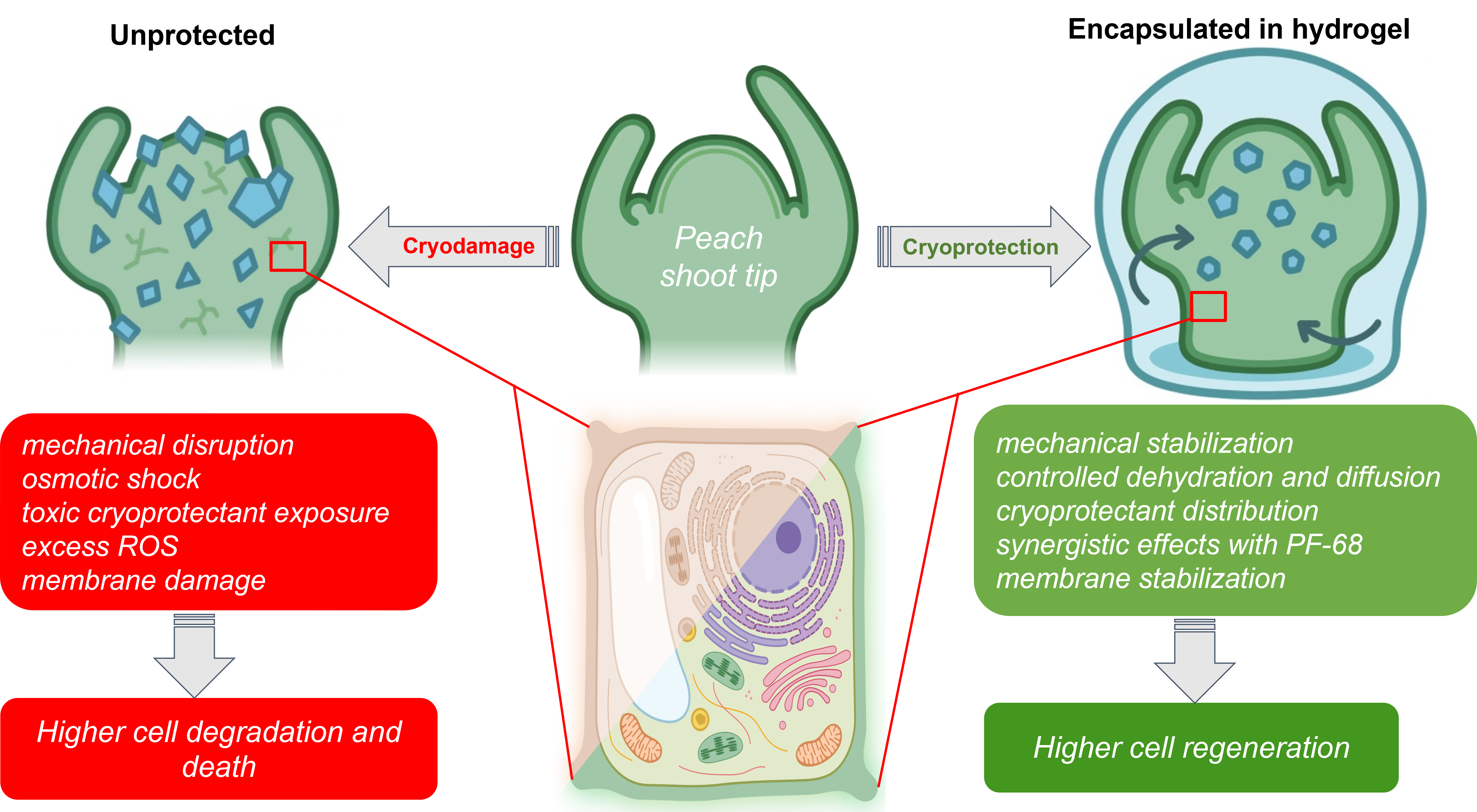 The study aimed to develop and evaluate a hydrogel-assisted vitrification approach that enhances cryoprotection and regeneration efficiency of peach shoot tips while maintaining their structural and physiological integrity.
