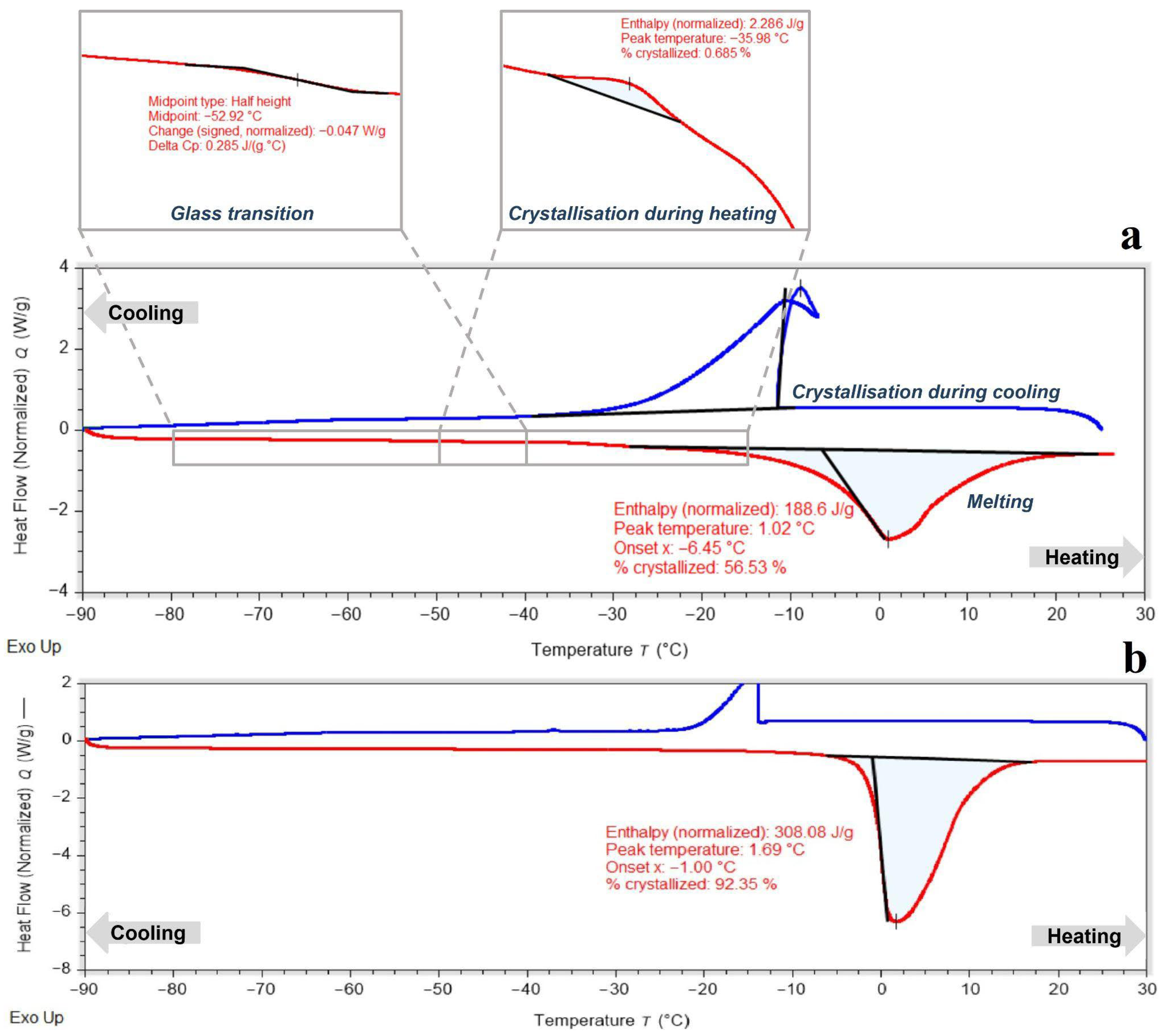 Figure 2a). In most samples, no exothermic or endothermic transitions were observed upon heating, indicating the absence of ice crystallization or melting. Only minor transitions were detected in a few samples, with crystallization onset around −44.7 °C and melting near −28.1 °C. The proportion of crystallized water remained consistently below 0.5%, demonstrating that most of the water in the tissues had been converted into an amorphous glassy state during cooling, with only a small metastable fraction capable of recrystallizing upon warming at low warming rate.