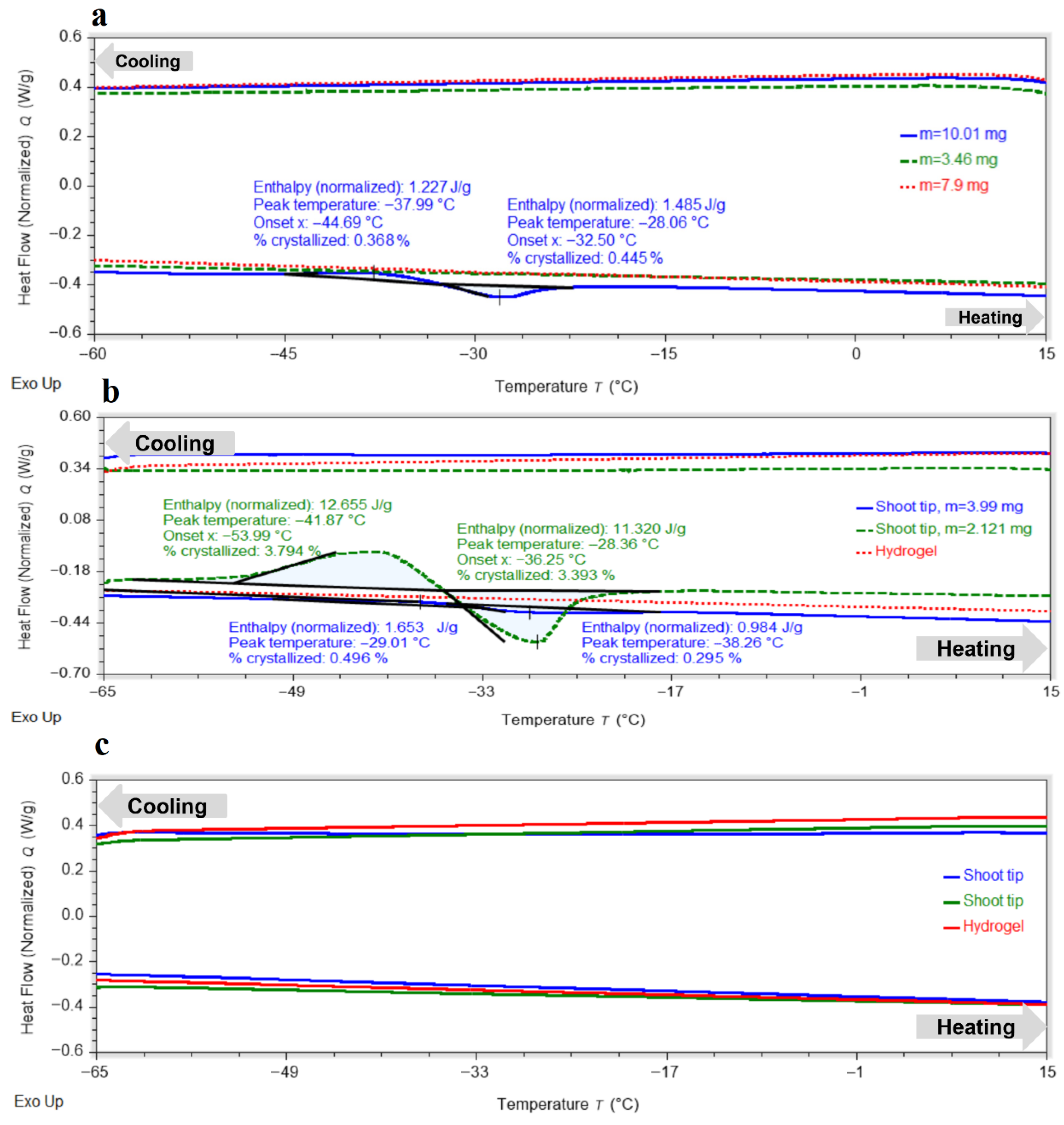 39]; however, in this study, we employed PVS3 (a DMSO-free mixture of glycerol and sucrose) to examine its vitrification capacity. DSC was used to determine the minimum exposure time required for sufficient tissue dehydration and stable amorphous matrix formation during both cooling and warming. This approach also allowed us to monitor dehydration dynamics in encapsulated and non-encapsulated shoot tips.