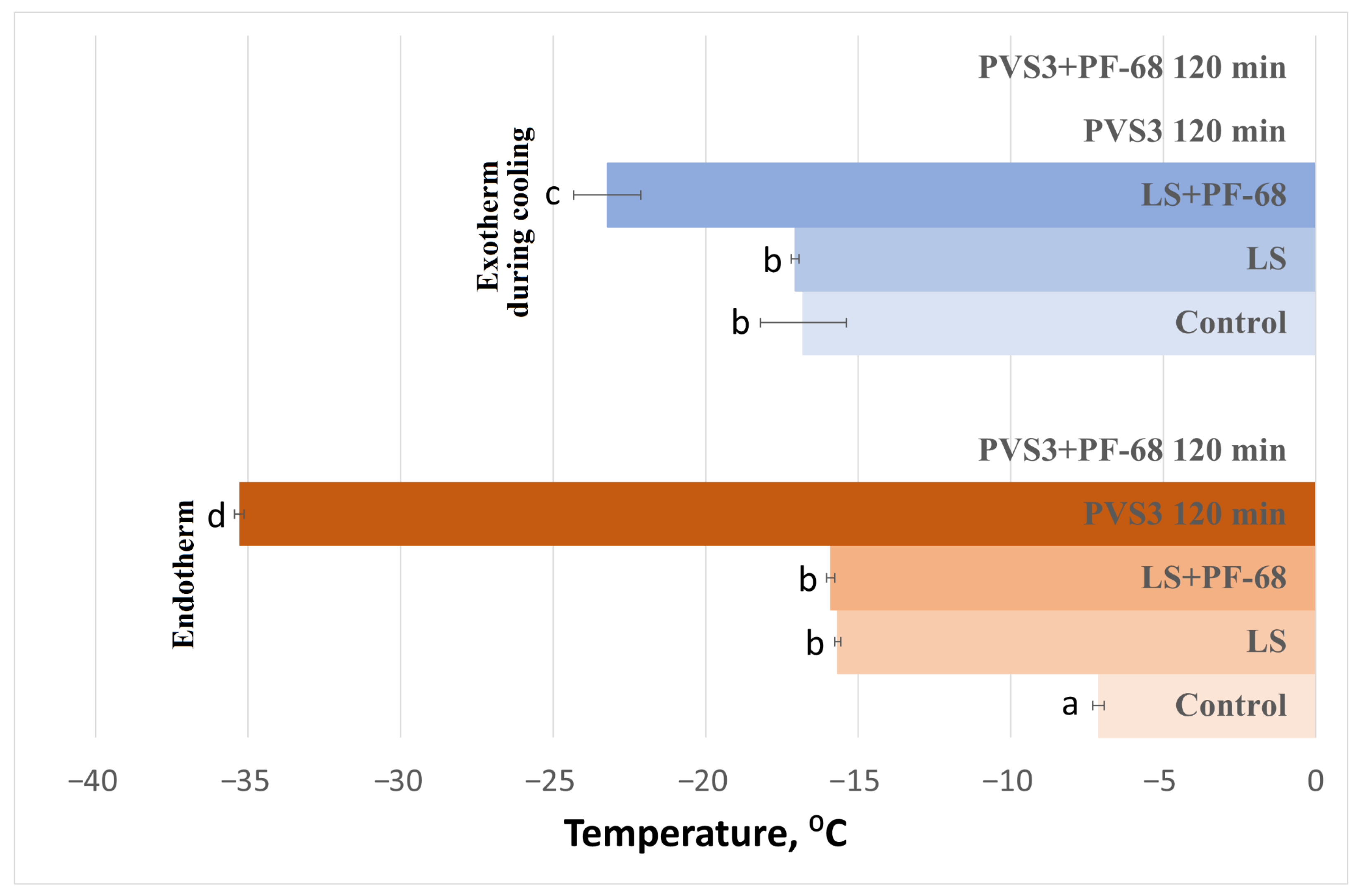 33]. In our system, PF-68 appeared to accelerate equilibration, as evidenced by the more rapid reduction in crystallization onset temperatures and enthalpies. This effect may be explained by improved wettability and enhanced cryoprotectant diffusion across tissue interfaces. In addition, PF-68 may interact with phospholipid membranes, buffering them against phase transitions and dehydration-induced perturbations, which are major contributors to cryo-injury in plant meristems. Although PF-68 is widely reported to reduce interfacial tension, stabilize membranes, and improve cryoprotectant equilibration, these effects were not directly measured in the present system. Future studies incorporating surface tension assays, membrane integrity markers, and solute diffusion measurements will be essential to experimentally validate the proposed surfactant-mediated mechanisms.
