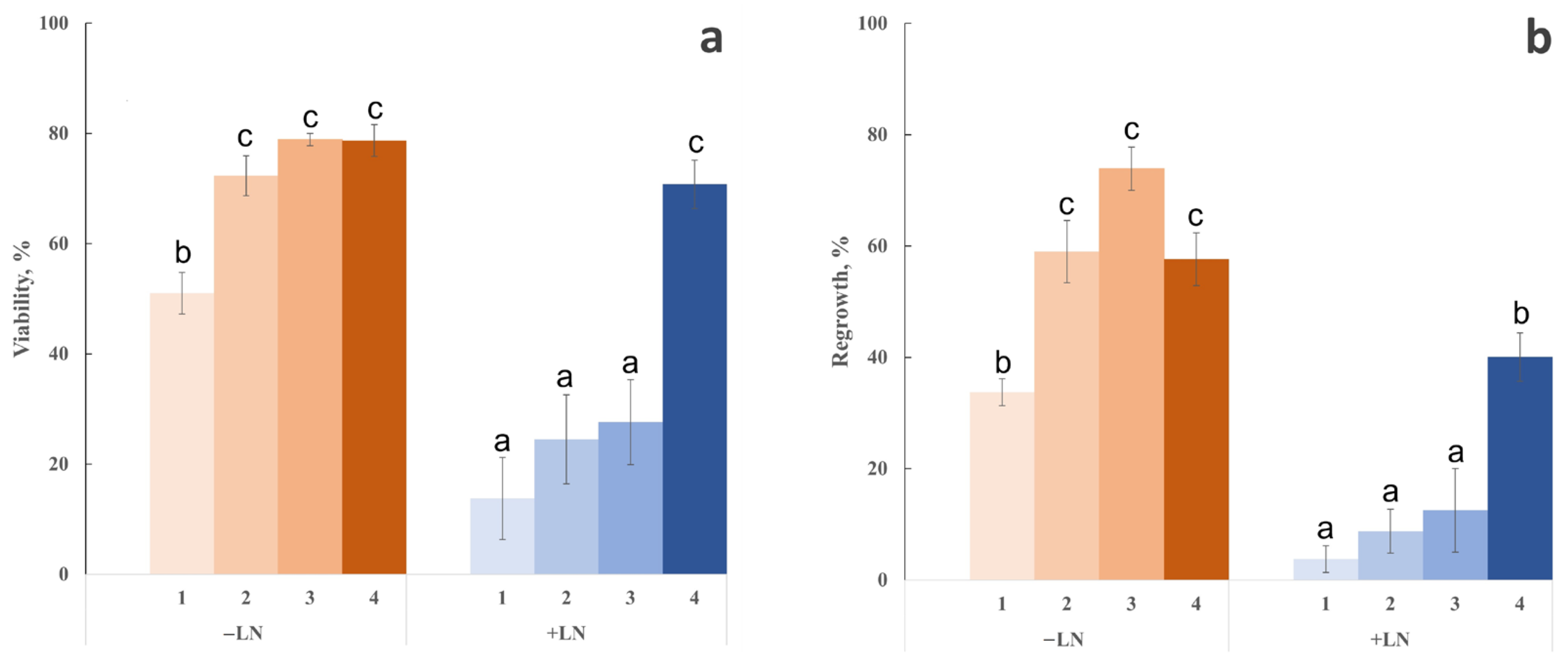 Shoot tips encapsulated in the modified hydrogel matrix (Groups 3 and 4) exhibited high viability even before freezing (−LN). After 120 or 150 min of incubation in PVS3, their survival and regrowth were comparable to or higher than those in Group 2 (classical vitrification with PF-68). Post-thaw survival and regrowth varied depending on the duration of PVS3 exposure. After 120 min of incubation, viability significantly decreased following LN exposure compared with unfrozen controls, with regrowth reaching only about 13%. Extending the incubation to 150 min markedly improved cryotolerance, yielding 71% viability (