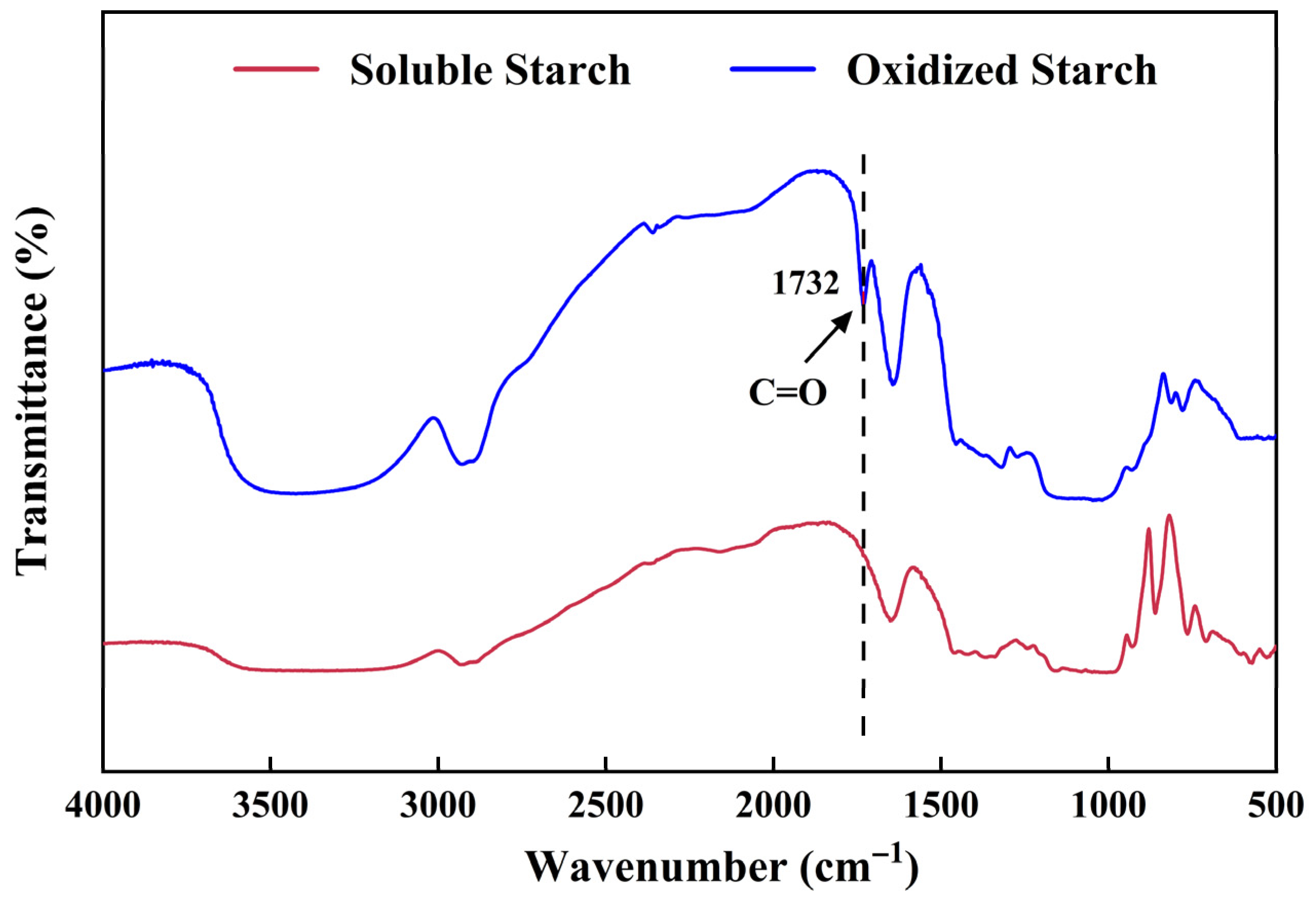 The FTIR spectra of soluble starch and OS were measured with a Nicolet Nexus 470 infrared spectrometer (Madison, WI, USA) in the scanning range of 400~4000 cm