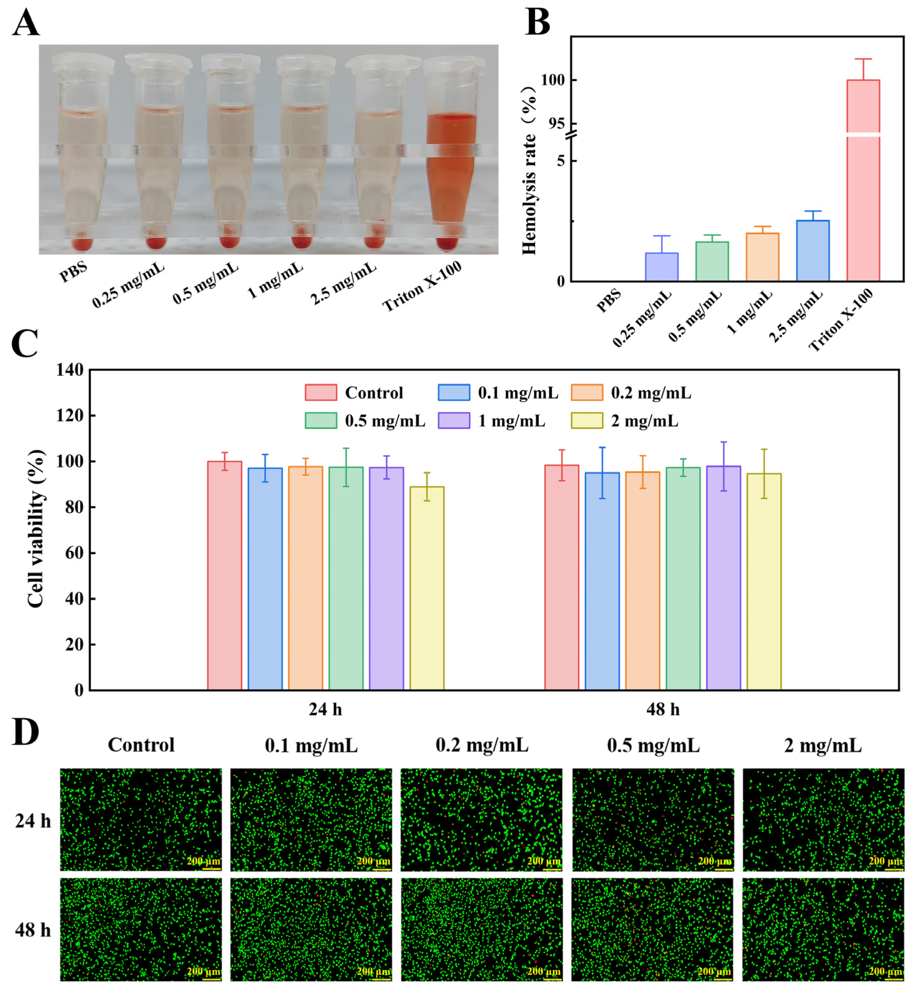 Rabbit blood and rabbit red blood cells (4%) were obtained from SenBeiJia Biological Technology Co., Ltd. (Nanjing, China). Dulbecco’s Modified Eagle’s Medium (DMEM) was obtained from Procell Life Science & Technology Co., Ltd. (Wuhan, China). The Live/Dead cell dichromatic stain was from Elabscience Biotechnology Co., Ltd. (Wuhan, China). The Cell counting kit-8 (CCK-8) was purchased from Ding Guo Chang Sheng Biotechnology Co., Ltd. (Beijing, China). Mice fibroblast cells (L929) were obtained from the Institute of Biochemistry and Cell Biology (Shanghai, China).