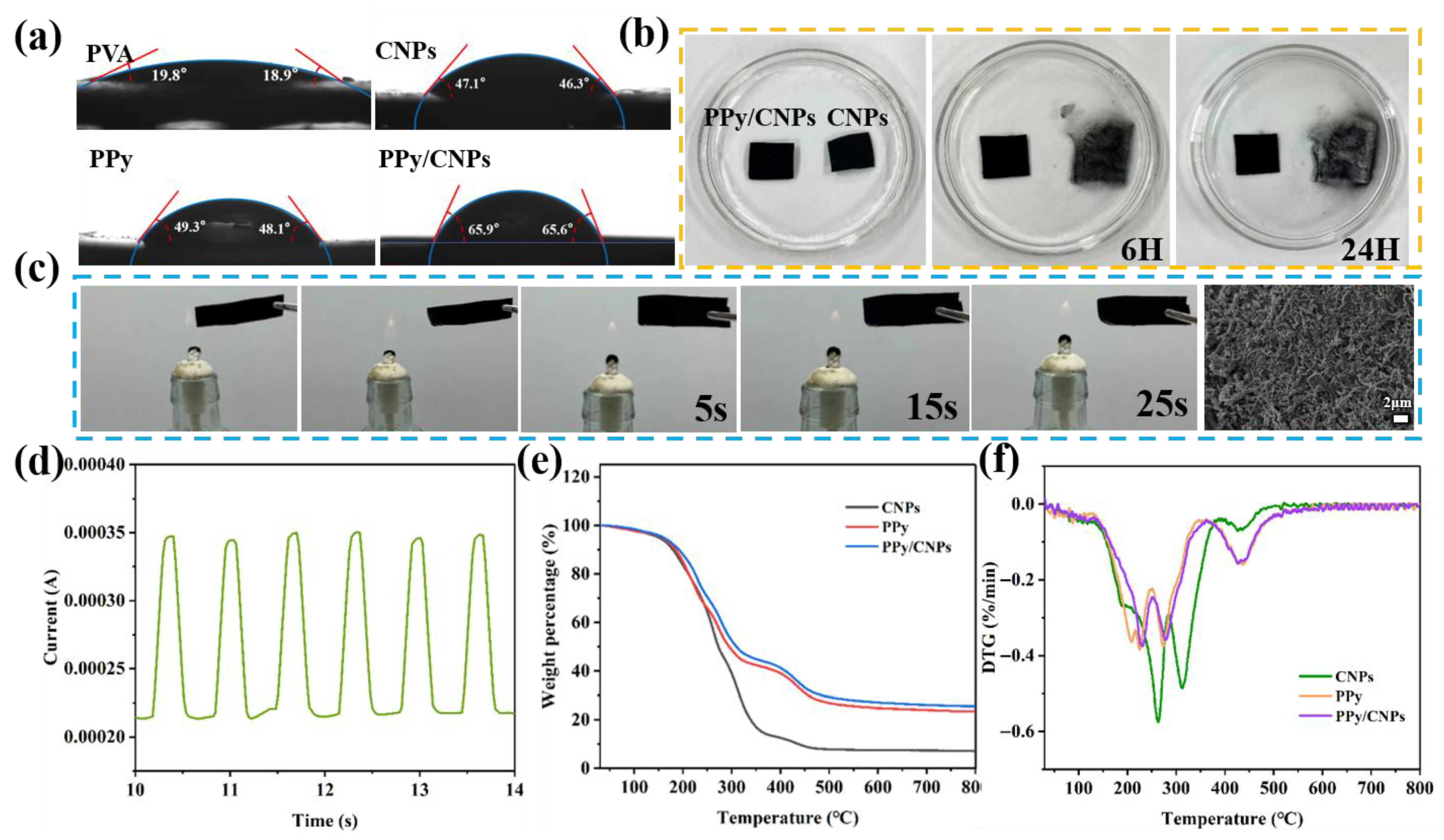 - Liu, X.; Shi, H.; Song, F.; Yang, W.; Yang, B.; Ding, D.; Liu, Z.; Hui, L.; Zhang, F. A highly sensitive and anti-freezing conductive strain sensor based on polypyrrole/cellulose nanofiber crosslinked polyvinyl alcohol hydrogel for human motion detection. Int. J. Biol. Macromol. 2024, 257, 128800. [Google Scholar] [CrossRef]