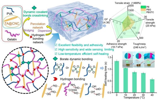 - Li, A.; Zhang, J.; Newton, M.A.A.; Liu, Y.; Li, T.; Xin, B. Multifunctional double network PVA-Borax/GO-cellulose nanofibrils hydrogel for wearable strain sensor. Polymer 2025, 337, 129027. [Google Scholar] [CrossRef]