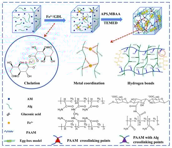 Schematic diagram of the synthesis route for constructing the Fe3+/Alg-PAAM dual-network hydrogel via free radical polymerization and the corresponding interactions within the dual network [33]. Copyright 2022, Elsevier.