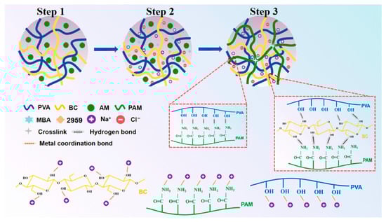 Photopolymerization crosslinking is a process that utilizes visible or ultraviolet light interacting with a photoinitiator to initiate chain polymerization and crosslinking of monomers, ultimately forming photocured oligomers with a network structure [41]. Photoinitiators play a key role in this process, initiating the polymerization reaction through photocatalytic action, enabling monomers to crosslink and form polymer networks with specific properties [42]. Lu et al. [43] synthesized a dual-network nanocomposite hydrogel (PAM/PVA/BC x-NaCly hydrogel) via in situ photopolymerization using AM, PVA, bacterial cellulose (BC), and NaCl as raw materials. The photoinitiator Irgacure 2959, under UV light, generated active radicals that initiated AM monomer polymerization to form the PAM network, resulting in a dual-network composite hydrogel with enhanced mechanical and conductive properties, as shown in Figure 5. Zhou et al. [44] synthesized a PDMAPS/P(DEAM-co-DMAM)/PCA-Na dual-network ionic conductive hydrogel (abbreviated LEC-Gel) via photopolymerization using an upper critical solution temperature (UCST) poly (ionic liquid) PDMAPS, a lower critical solution temperature (LCST) neutral polymer P(DEAM-co-DMAM), and the natural moisturizing factor sodium pyrrolidone carboxylate (PCA-Na). The resulting hydrogel exhibited ultra-high ductility (1500%), good fatigue resistance, and high sensitivity. Tang et al. [45] synthesized a PNIPAM/AM/MMA-HPMC dual-network hydrogel (abbreviated PNHMA) via photopolymerization using N-isopropylacrylamide (NIPAM), AM, methyl methacrylate (MMA), hydroxypropyl methylcellulose (HPMC), NaCl, and the ionic liquid [EMIM] BF4. Photocatalysis (i.e., UV irradiation at 365 nm wavelength) caused cleavage of the C=C bonds in NIPAM, AM, and MMA monomers, forming C-C bonds with the crosslinker MBA, endowing the resulting hydrogel material with low-temperature stability, high stretchability, high sensitivity, and thermoelectric responsiveness.