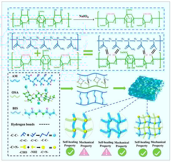 Preparation of (OSA/PAM) dual-network conductive hydrogel by click chemistry and its synthesis mechanism [52]. Copyright 2025, Elsevier.