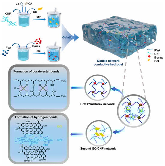 Physico-chemical hybrid crosslinking is an effective strategy for preparing DNHs, combining the advantages of physical and chemical crosslinking to achieve excellent comprehensive properties. Through the synergistic effect of physical and chemical crosslinking, the mechanical strength, conductivity, self-healing ability, and environmental adaptability of hydrogels can be significantly enhanced, giving them broad application prospects in fields such as flexible electronic devices. Zhang et al. [54], through the synergistic effect of physical and chemical crosslinking, synthesized a PVA/PAA@PEGDMA/PEDOT: PSS dual-network conductive hydrogel (named PPPH) using PVA, AA, polyethylene glycol dimethacrylate (PEGDMA), and the conductive polymer PEDOT: PSS as raw materials. Chemical crosslinking was primarily achieved using PEGDMA as a multifunctional crosslinker, connecting short PAA chains into longer segments and elastic interchain bridges via covalent bonds, forming a uniform and highly interconnected network structure, and inhibiting microphase separation and structural defects. Physical crosslinking was achieved through hydrogen bonding entanglement between PVA molecules and the PAA network, as well as strong intermolecular forces via hydrogen bonding between the conductive polymer PEDOT: PSS and PAA. This significantly enhanced the mechanical strength and conductivity of the hydrogel. Wang et al. [55] adopted a physico-chemical hybrid crosslinking method to synthesize a dual-network hydrogel by introducing polypyrrole (PPy), using AM, N,N-dimethylacrylamide (DMAA), N-hydroxymethylacrylamide (NMA), and methyl cellulose (MC) as raw materials. Chemical crosslinking was primarily achieved via UV-induced crosslinking polymerization at 70 °C, using AM, DMAA, or NMA as monomers, and N,N′-methylenebisacrylamide (MBA) as the chemical crosslinker, ensuring the structural integrity of the first network. Physical crosslinking was achieved through multi-level hydrogen bonds, including the first-level hydrogen bonds (HB-1) formed between the amide groups of the AM derivatives and the hydroxyl groups of MC, the second-level hydrogen bonds (HB-2) formed between the imino groups of PPy and the amide groups of the AM derivatives, and the third-level hydrogen bonds (HB-3) formed between the imino groups of PPy and the hydroxyl groups of MC. This significantly enhanced the ductility, conductivity, strength, toughness, and self-healing capability of the hydrogel. Li et al. [56] developed a (PVA-Borax/GO-CNF) dual-network conductive hydrogel via a physico-chemical crosslinking strategy using PVA, borax, graphene oxide (GO), and CNF as raw materials, as shown in Figure 7. Chemical crosslinking was primarily achieved through the formation of dynamic borate ester bonds between PVA and borax, while GO and CNF formed ultra-rigid chemical crosslinks through covalent interactions and CH-π stacking. Physical crosslinking was achieved through freeze–thaw cycles to enhance the mechanical properties and stability of the hydrogel; hydrogen bonding between the amino groups of CS and the hydroxyl groups of PVA also promoted phase separation and increased porosity. This enabled the hydrogel to possess both high sensitivity and excellent mechanical properties.