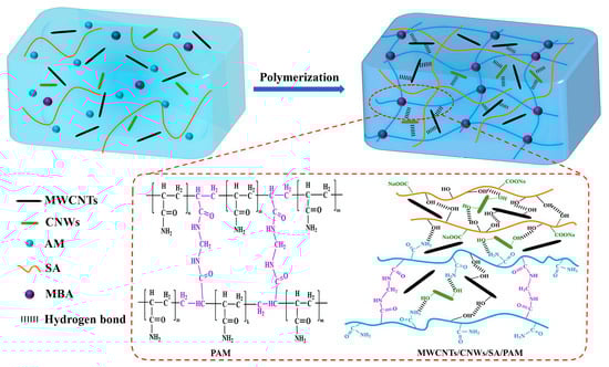 Schematic diagram of MWCNTs/CNMs/PAM/SA dual-network hydrogel [73]. Copyright 2025, Elsevier.