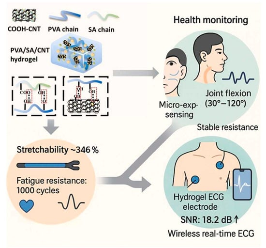 - Ding, Y.; Hou, Y.; Liu, W.; Liu, Y.; Liu, Q.; Yao, Y.; Chen, D. Wearable strain sensor based on double network PVA/SA/CNT hydrogel for reliable electrocardiography and motion monitoring. Sens. Actuators A Phys. 2025, 396, 117196. [Google Scholar] [CrossRef]