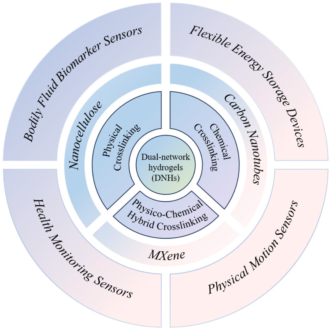 In recent years, dual-network hydrogels (DNHs, referring to a special hydrogel structure composed of two networks formed from two or more different materials interpenetrating to form a dual-network.), as novel materials, have attracted widespread attention in flexible electronic devices. They maintain the advantages of traditional hydrogels, such as high-water content and high viscoelasticity, while overcoming the drawbacks of low mechanical strength, poor conductivity, and poor fatigue resistance [7,8,9]. Ongoing research on DNHs has found that incorporating fillers (e.g., nanocellulose, carbon nanotubes, MXene) can effectively enhance the mechanical properties, conductivity, and sensitivity of hydrogels, addressing limitations such as poor stability, low electrical conductivity, and inferior mechanical performance. Research on the application of dual-network hydrogels modified dual-network hydrogels in the field of flexible wearable electronics is extensive yet fragmented. Therefore, a systematic review is needed to summarize the current state of research and facilitate further investigations into dual-network hydrogel materials for flexible wearable electronics.