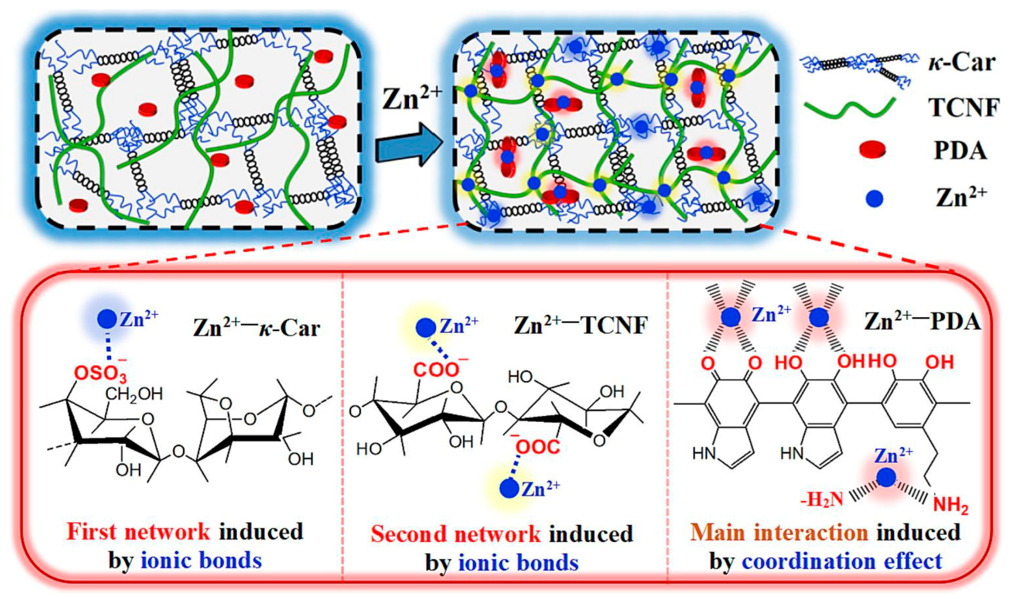 Strong ionic interactions between metal cations and hydrogel precursors can induce rapid gelation. Chen et al. [21] prepared a novel κ-carrageenan (κ-Car) dual-network hydrogel via ionic interactions by introducing TEMPO-oxidized cellulose nanofibrils (TCNF) and polydopamine (PDA) nanoparticles, as shown in Figure 2. Al3+, due to its trivalent nature, exhibits stronger electrostatic attraction and can form stronger bonds with the carboxylate groups of TCNF; Zn2+ binds via ionic interactions with the sulfate groups of κ-Car, the carboxylate groups of TCNF, and the catechol/amine groups of PDA. This not only promoted rapid gelation but also formed an interconnected porous structure, enhancing the mechanical properties and conductivity of the hydrogel. Wang et al. [22] synthesized a conductive hydrogel with a dual ionic network via ionic interactions using chitosan and PAA-co-AM. The trivalent Al3+ cations are primarily coordinated with the carboxyl groups of PAA-co-AM, consolidating the covalent network; after soaking chitosan molecules in sodium sulfate solution, they crosslinked with SO42− ions, forming numerous Ch-SO42− networks, providing the hydrogel with excellent tensile recovery, high strength, and toughness.