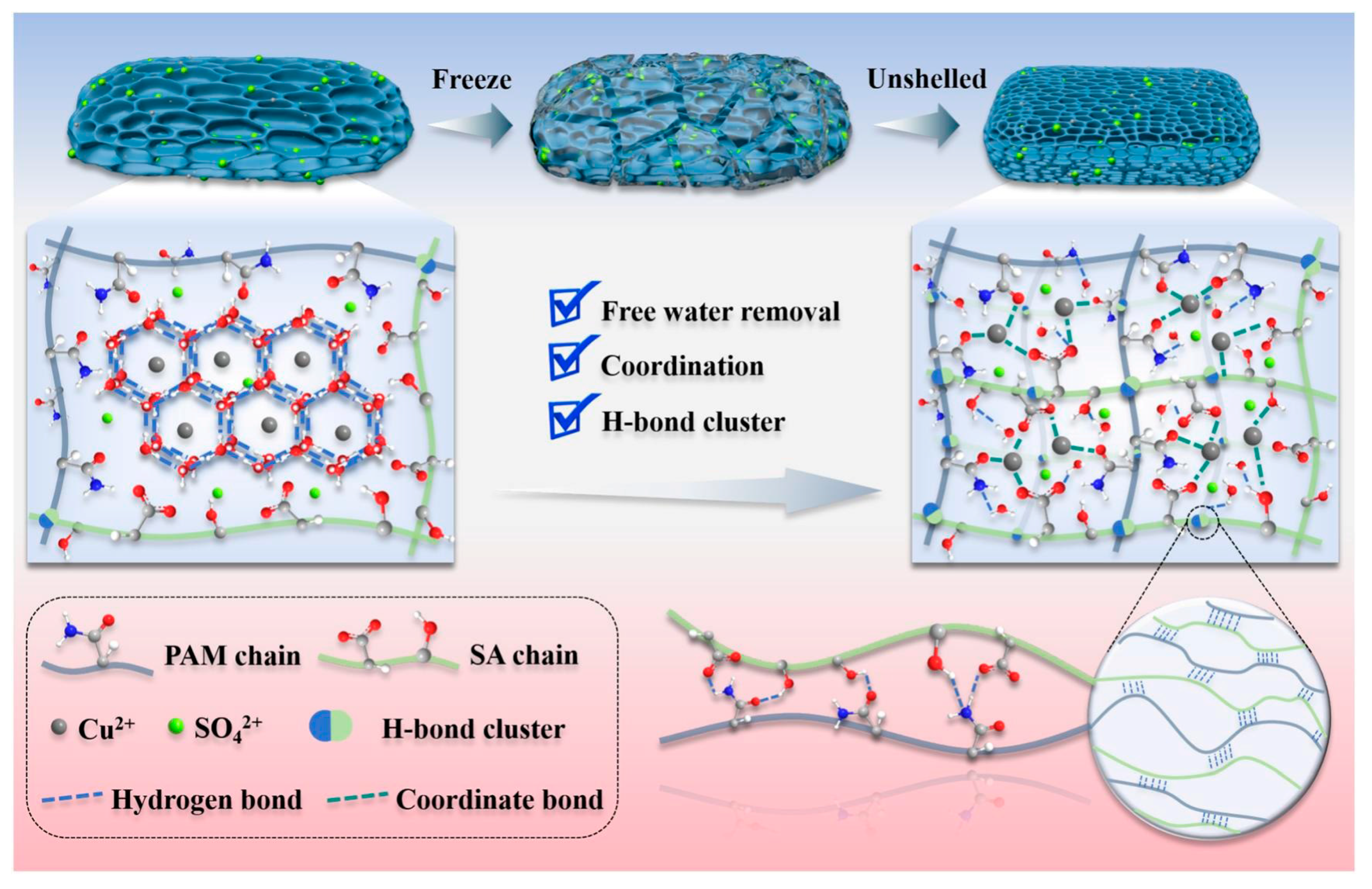 Metal ions play a key role in hydrogel formation, influencing their mechanical strength, self-healing properties, and conductivity. Wei et al. [24] prepared a dual-network hydrogel using a refreezing-assisted metal complexation (RAMC) strategy, as shown in Figure 3. Free water was removed in the form of ice shells, and functional groups on the molecular chains could form multiple coordinations with transition metals (Cu, Zn, Fe, Co, Ni), enhancing network structural strength and ionic conductivity. The resulting Cu/PAM/SA hydrogel exhibited a mechanical tensile strength of 2.201 MPa, high stretchability of nearly 250%, and a conductivity of 134.11 mS cm−1. Luo et al. [25] prepared an alkali lignin-polyvinyl alcohol-polyacrylic acid dual-network conductive hydrogel with high mechanical strength and good self-healing performance via metal coordination. The addition of Fe3+, forming metal-coordination bonds with PAA, significantly enhanced the mechanical strength, toughness, and self-healing performance of the hydrogel. Liu et al. [26] developed a tough, anti-swelling, highly conductive dual-network hydrogel via metal coordination. By adding Zr4+, which formed metal chelates with the carboxyl groups of acrylic acid (AA), the prepared hydrogel exhibited a tensile strength up to 0.92 MPa, toughness of 3.35 MJ m−3, conductivity of 3.28 S m−1, and excellent self-healing ability and anti-swelling capacity.