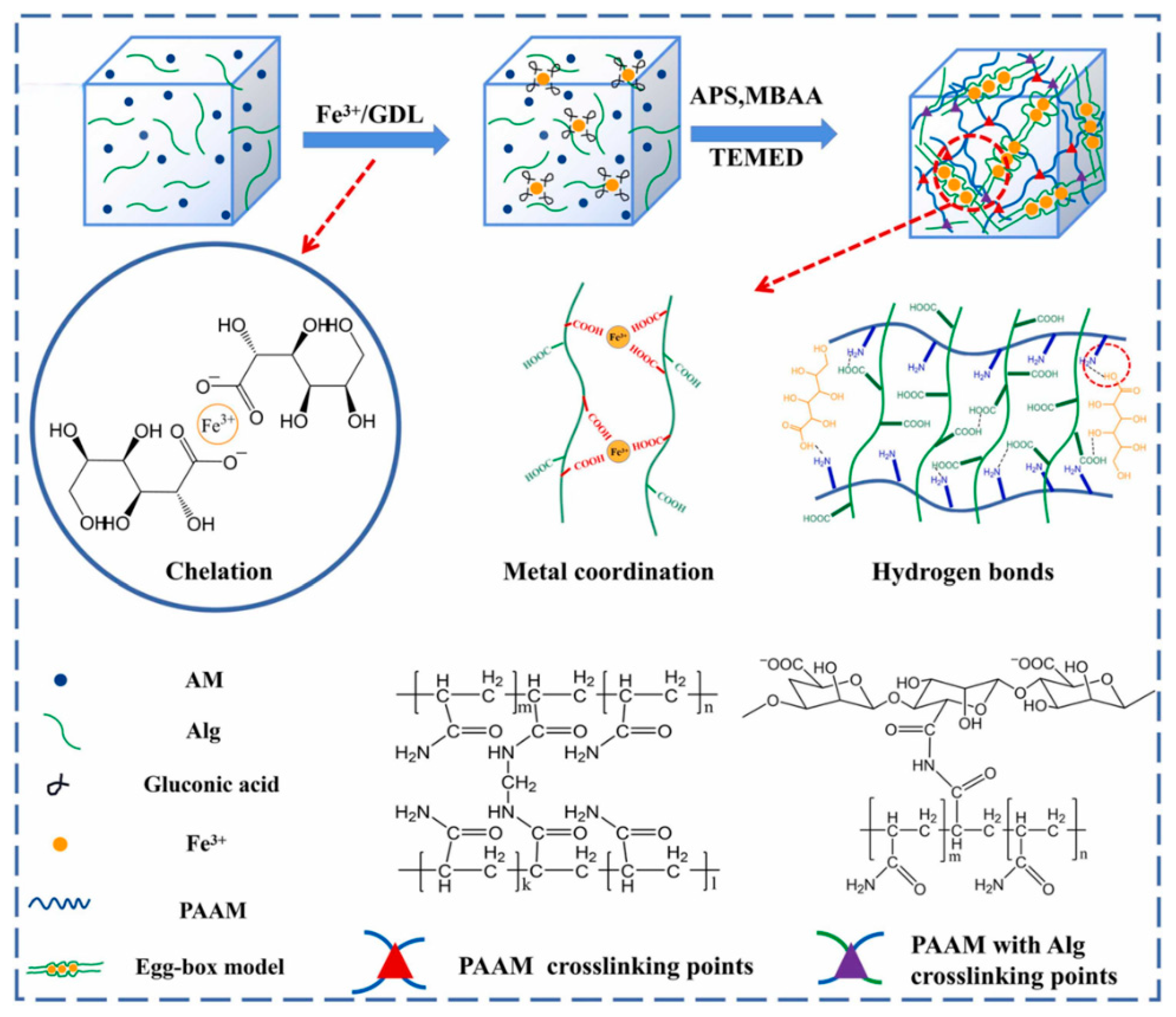 Figure 4. Schematic diagram of the synthesis route for constructing the Fe3+/Alg-PAAM dual-network hydrogel via free radical polymerization and the corresponding interactions within the dual network [33]. Copyright 2022, Elsevier.