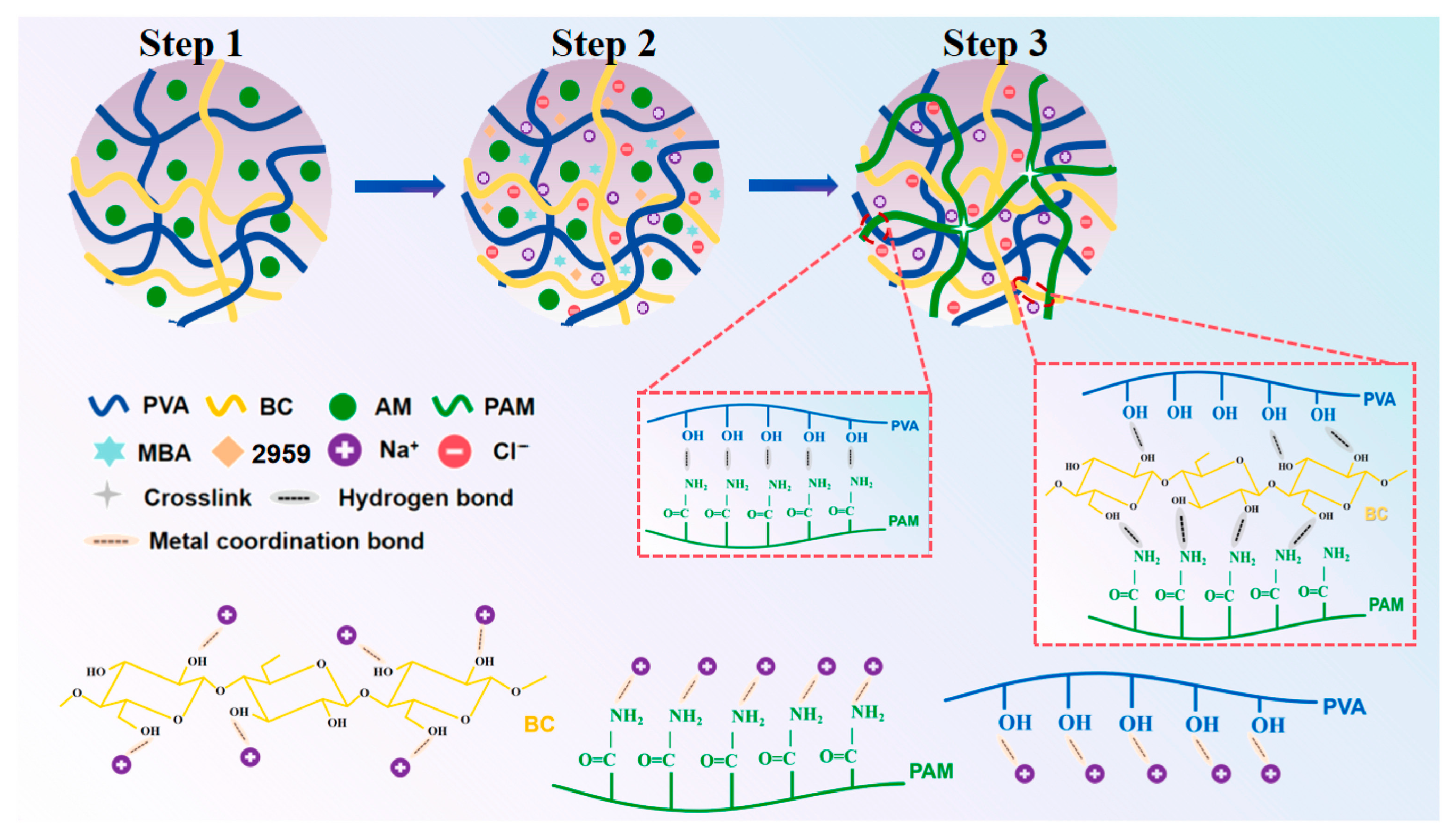 Figure 3. Schematic diagram of the mechanism for constructing a robust Cu/PAM/SA dual-network hydrogel via metal coordination [24]. Copyright 2025, Elsevier.