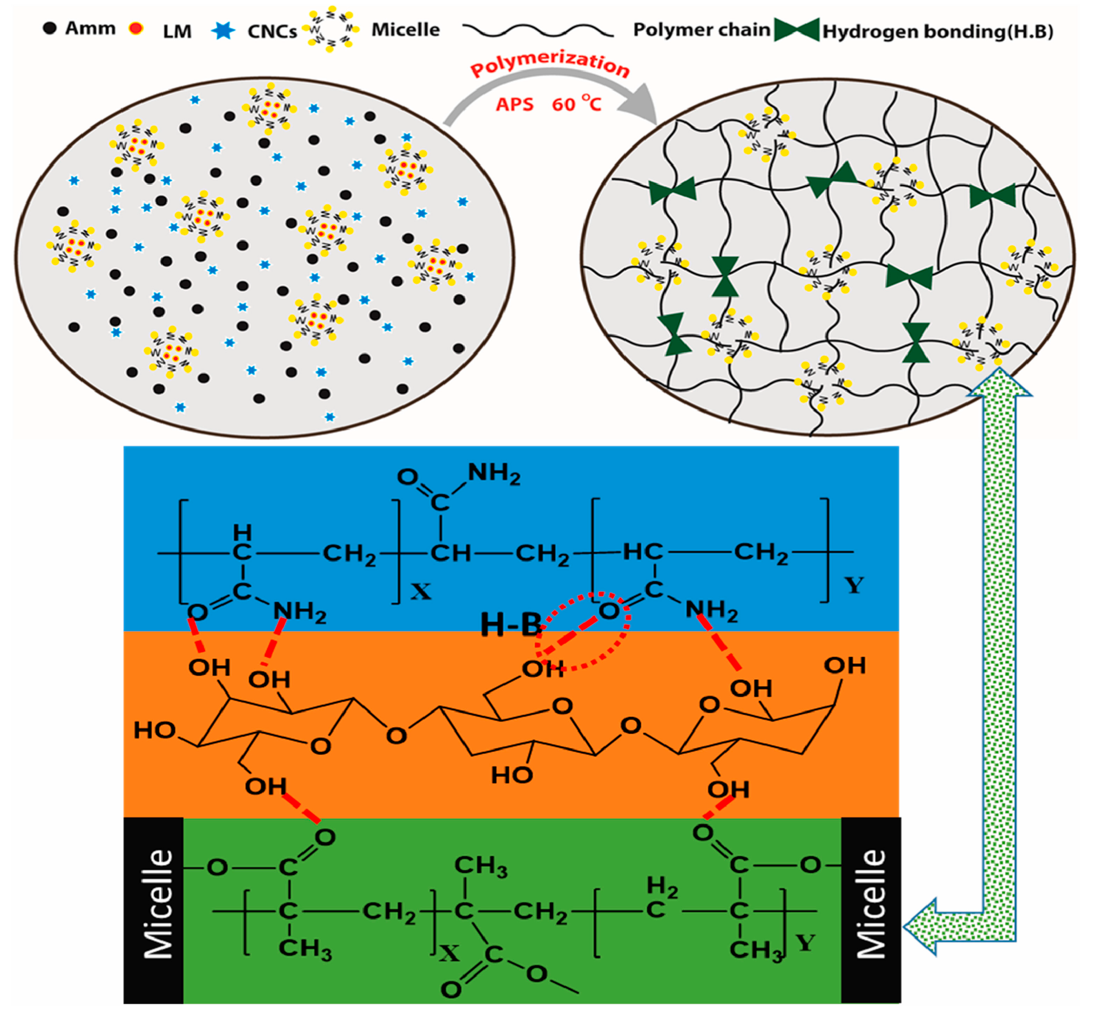 Figure 8. Schematic diagram of the polymerization process and the hydrogen bond between the polymer chain and the filler CNC [59]. Copyright 2023, Elsevier.