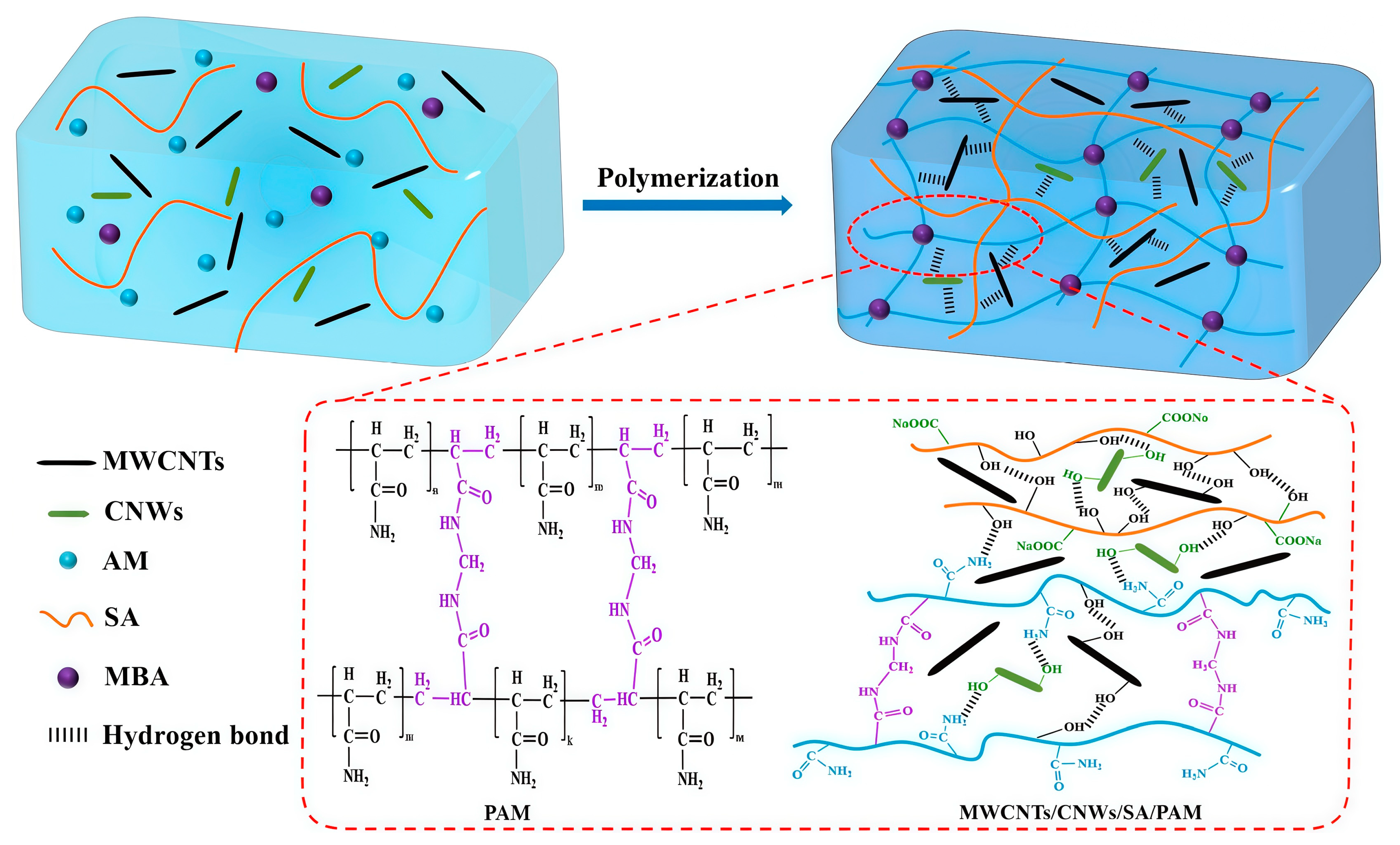 Figure 10. Schematic diagram of MWCNTs/CNMs/PAM/SA dual-network hydrogel [73]. Copyright 2025, Elsevier.
