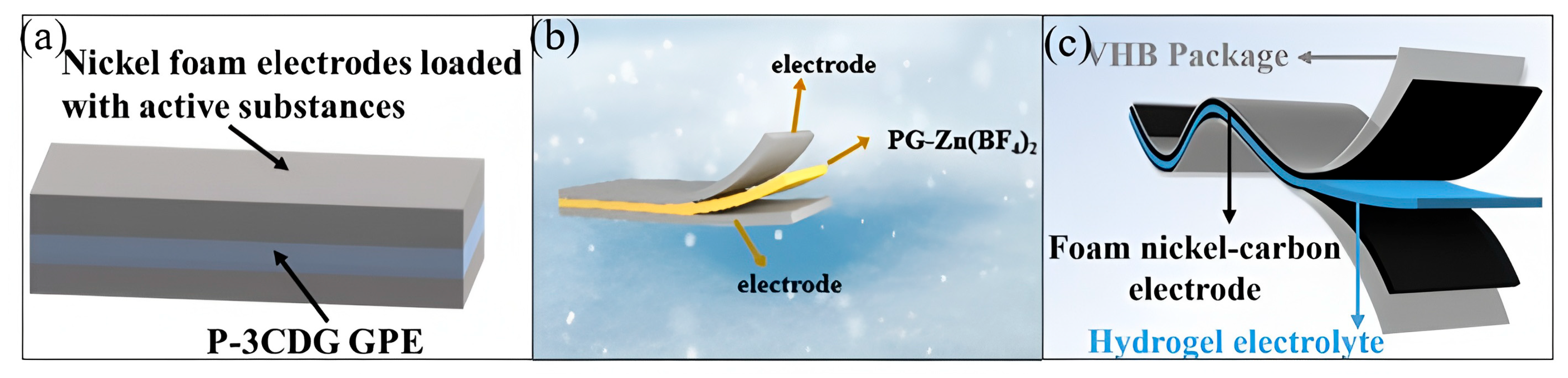 Figure 13. Application of dual-network hydrogels in flexible energy storage devices: (a) Schematic diagram of a capacitor assembled using P-3CDG GPE [92]. Copyright 2025, Elsevier. (b) Schematic diagram of the assembled supercapacitor device [95]. Copyright 2025, Elsevier. (c) Schematic diagram of supercapacitors based on PAM/PVA/LiTFSI-x% hydrogel [96]. Copyright 2024, Elsevier.