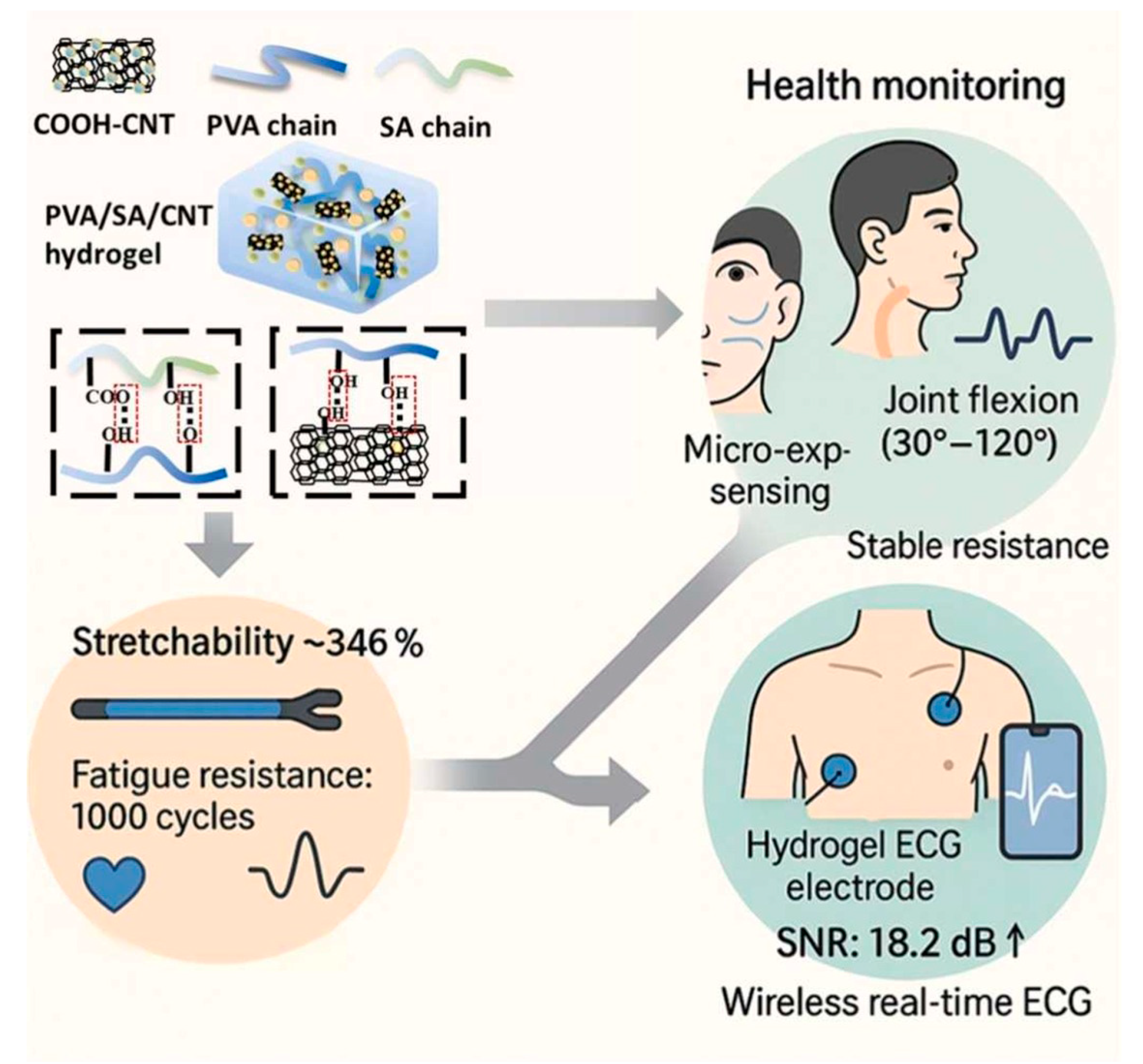 99. Ding, Y.; Hou, Y.; Liu, W.; Liu, Y.; Liu, Q.; Yao, Y.; Chen, D. Wearable strain sensor based on double network PVA/SA/CNT hydrogel for reliable electrocardiography and motion monitoring. Sens. Actuators A Phys. 2025, 396, 117196. [Google Scholar] [CrossRef]