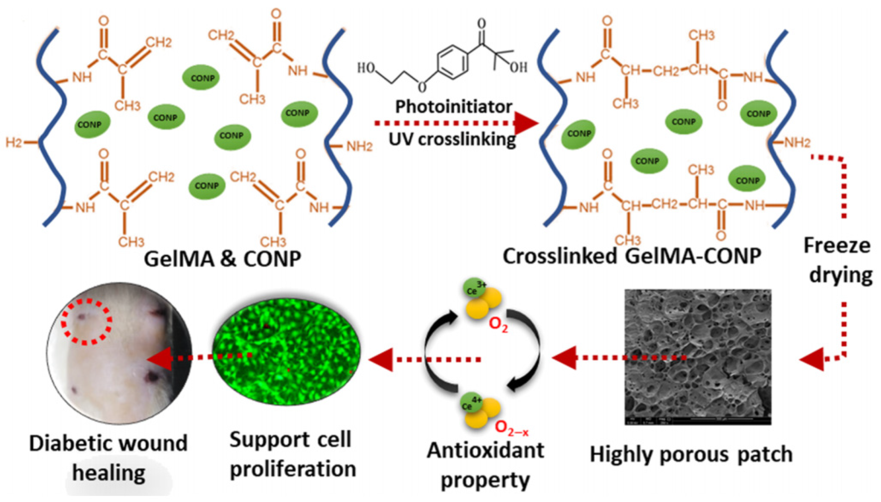 - Augustine, R.; Zahid, A.A.; Hasan, A.; Dalvi, Y.B.; Jacob, J. Cerium oxide nanoparticle-loaded gelatin methacryloyl hydrogel wound-healing patch with free radical scavenging activity. ACS Biomater. Sci. Eng. 2021, 7, 279–290. [Google Scholar] [CrossRef]