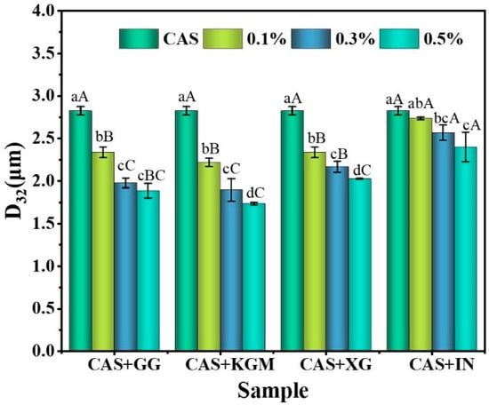 D32 of polysaccharide/CAS emulsions. Different lower/uppercase letters in the graphs indicate significant differences in emulsion D32 for different concentrations of the same polysaccharide or for different polysaccharides at the same concentration (p < 0.05).