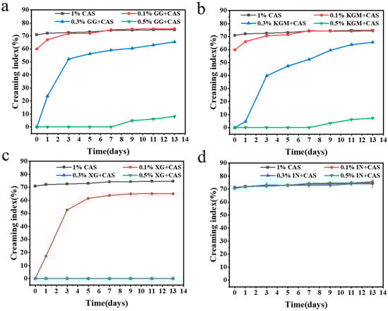 Creaming index of GG/CAS emulsions (a), KGM/CAS emulsions (b), XG/CAS emulsions (c), and IN/CAS emulsions (d).