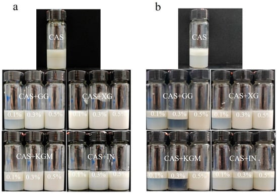 Visual appearance images of polysaccharide/CAS emulsions at 0 days (a) and 13 days (b).